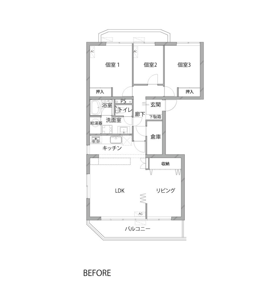 間仕切り、キッチン家具を撤去し、広々としたLDKに。