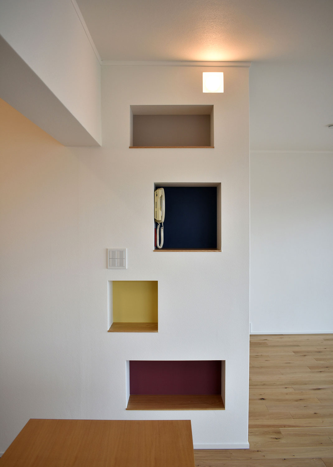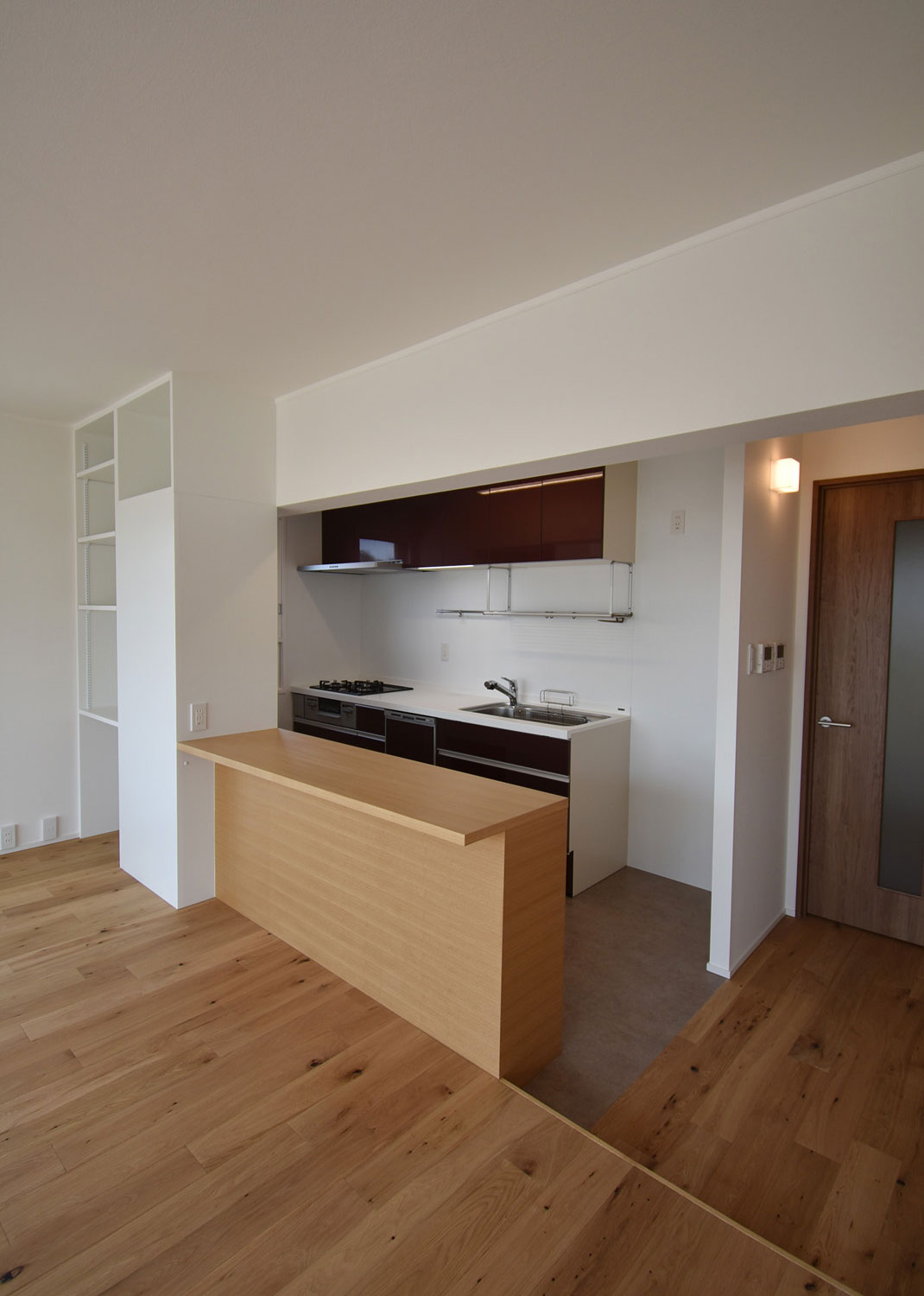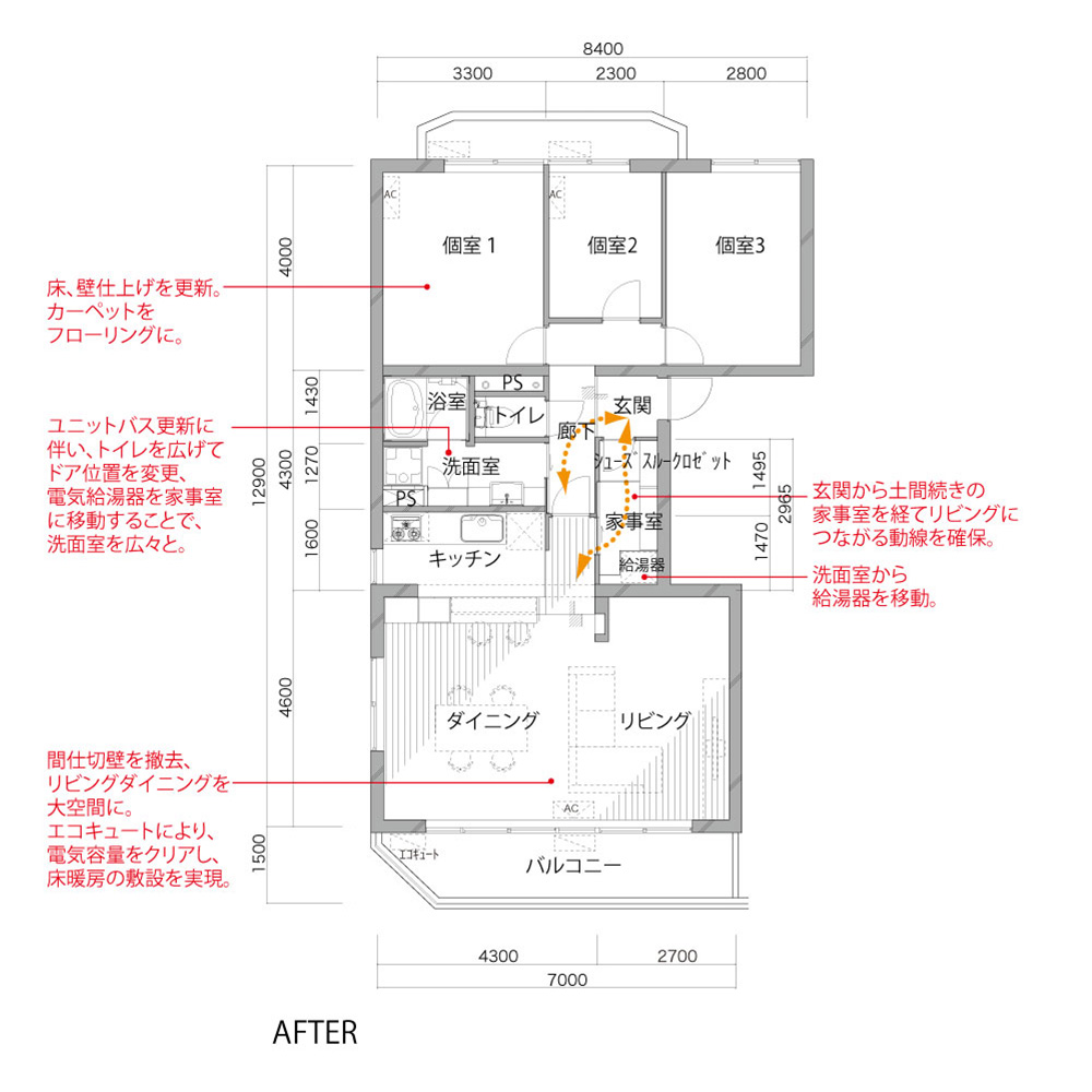 築40年のマンションのリノベーション。洗面室に鎮座する電気温水器の位置を移動して洗面室を充実させること、リビングに床暖房をいれたいというご要望を受け、エコキュートを導入することなど、水回りと設備の更新が肝となりました。間仕切を取り払って広いLDKとすると同時に、床暖房導入のために、二重床で床あげをしたことで、遮音縛りのないフローリング選択の可能性が広がりました。個室3室については、押入れ撤去と模様替え、ドア交換のみとし、一部アクセントクロスを導入して色付けをしています。玄関土間から、シューズインクロゼット、ユーティリティをつなげて、リビングにつながる 動線を新たに構築し、回遊性のあるプランとしています。