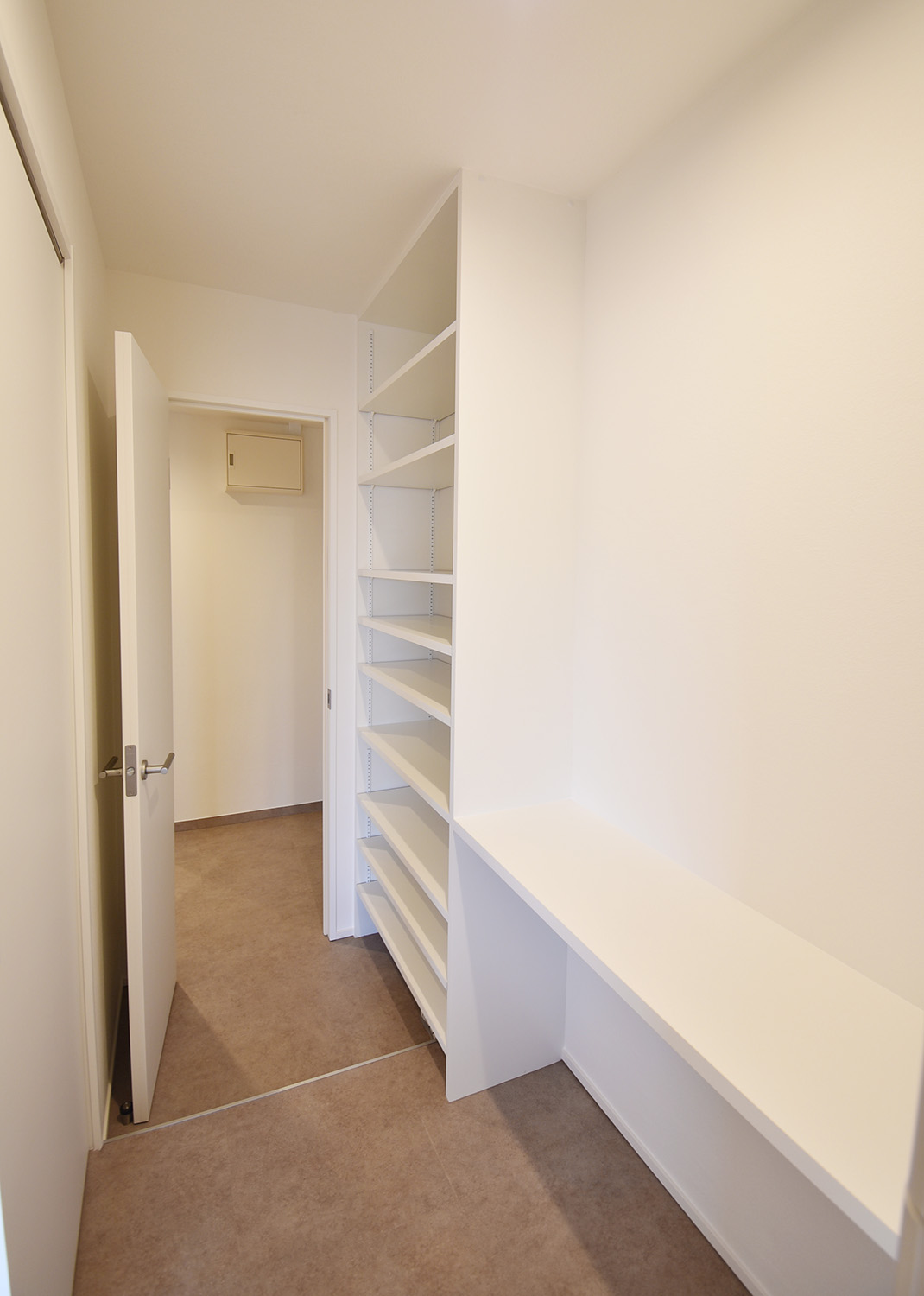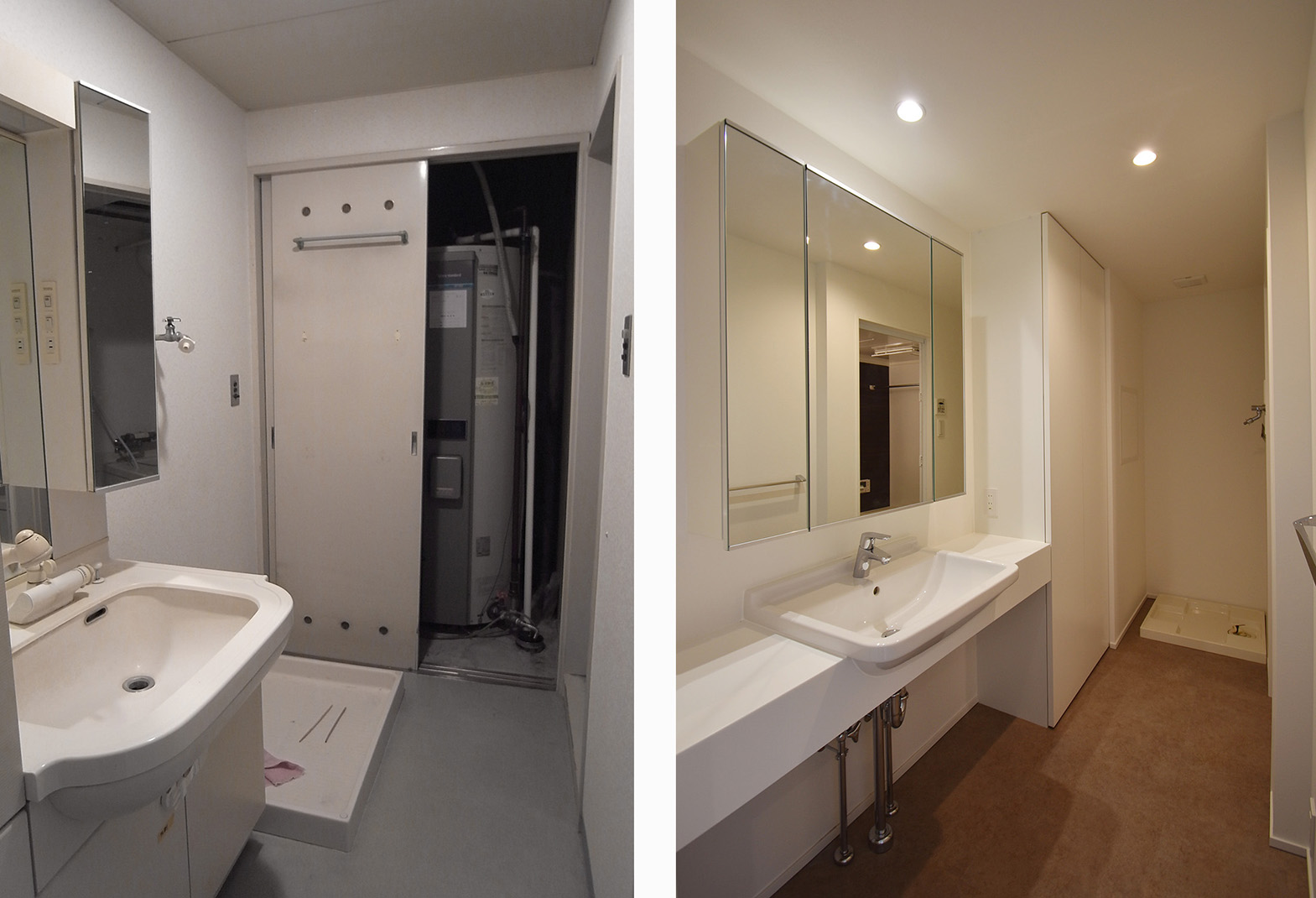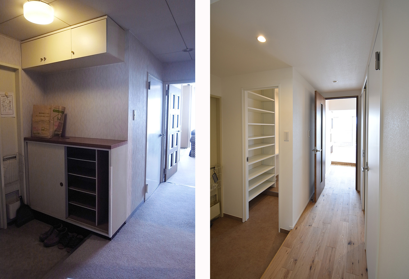 電気給湯器を玄関収納内に移動し、カウンターを広げ、リネン収納を設置。