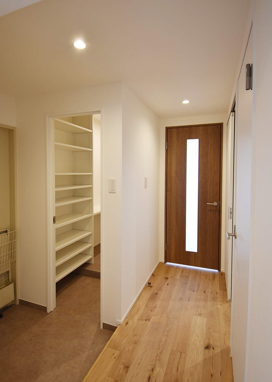 玄関土間からウォークスルーの下足収納を経てLDKへと、回遊できる形に。