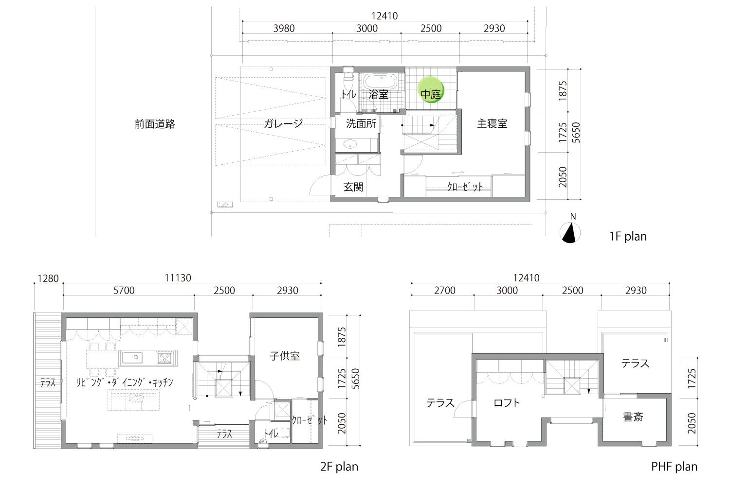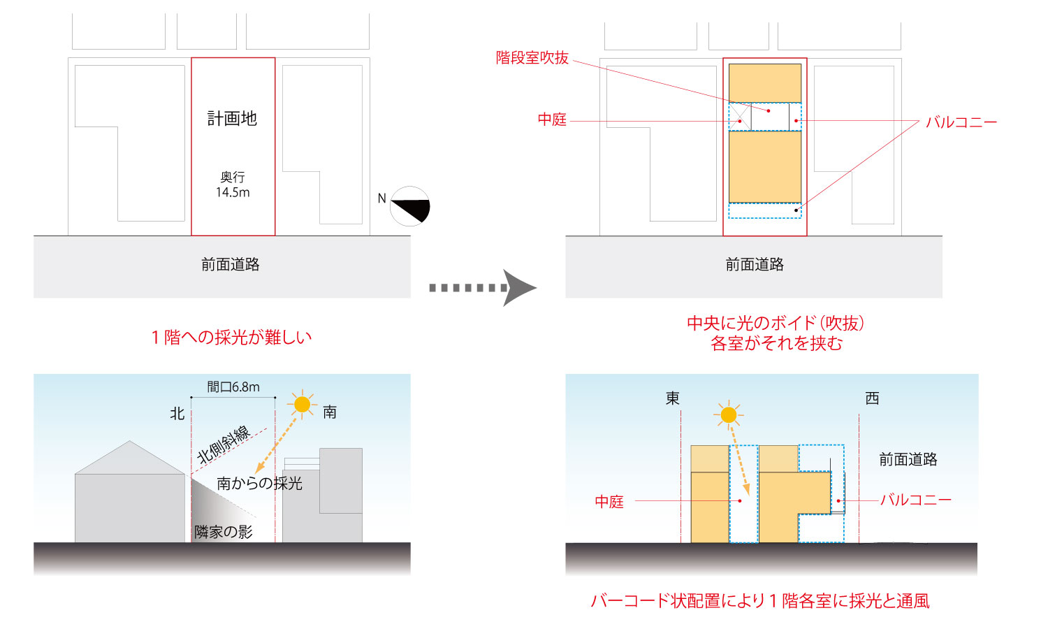 間口が狭く奥行きがあり、三方に住宅が近接している都市部の敷地。北側に中庭を設けることで、隣地と密接した北側の個室にも、光と風をとりいれています。中庭を介して、常に家族の気配を感じることができ、プライベート空間が孤立しないようなプランとしました。外部空間と建物ボリュームをバーコード状(交互)に配置することで採光と通風を有効にし、空間に広がりを与えています。前面テラスは道路からのバッファーに、中央のテラスはユーティリティとして、中庭は浴室に露天風呂効果を与えるなど、それぞれの外部空間がそれぞれに機能しています。
