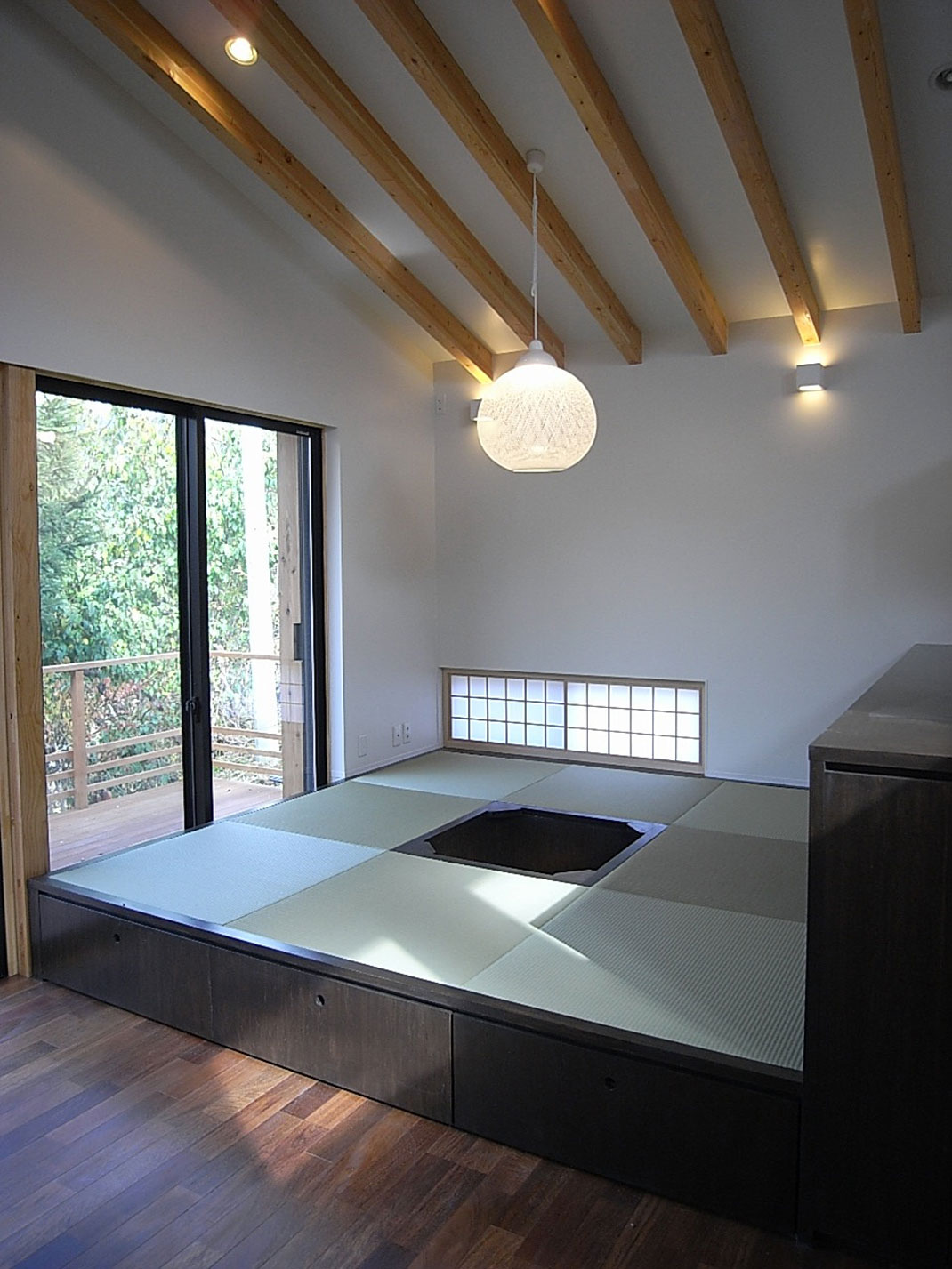 全ての室から風景をのぞめる形でテラスに面する並列配置としています。 ときに人が集まって作業をする場所として、アトリエを兼ねるリビング・ダイニングのパブリック部分を吹抜の平屋のボリュームとし、個室や水回りのプライベート部分は2層のボリュームとしてゾーンをわけています。家族が団らんできるスペースとして、小上がりの掘りごたつスペースを設けました。