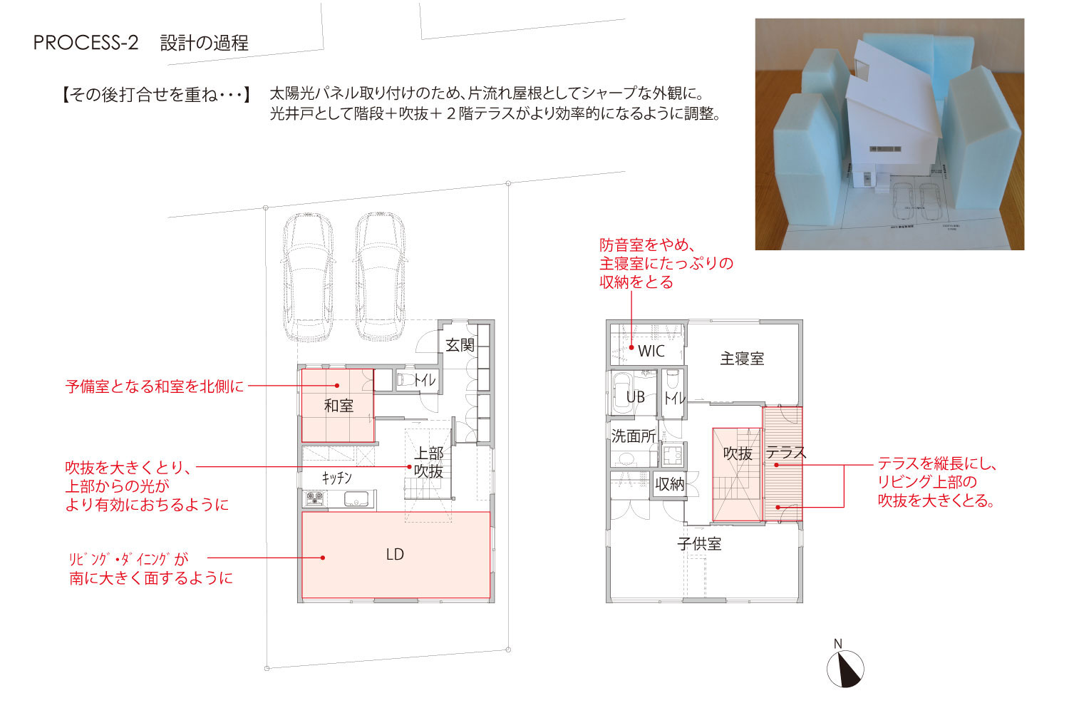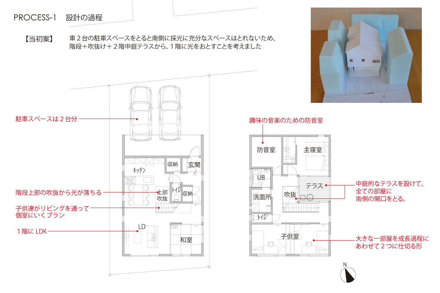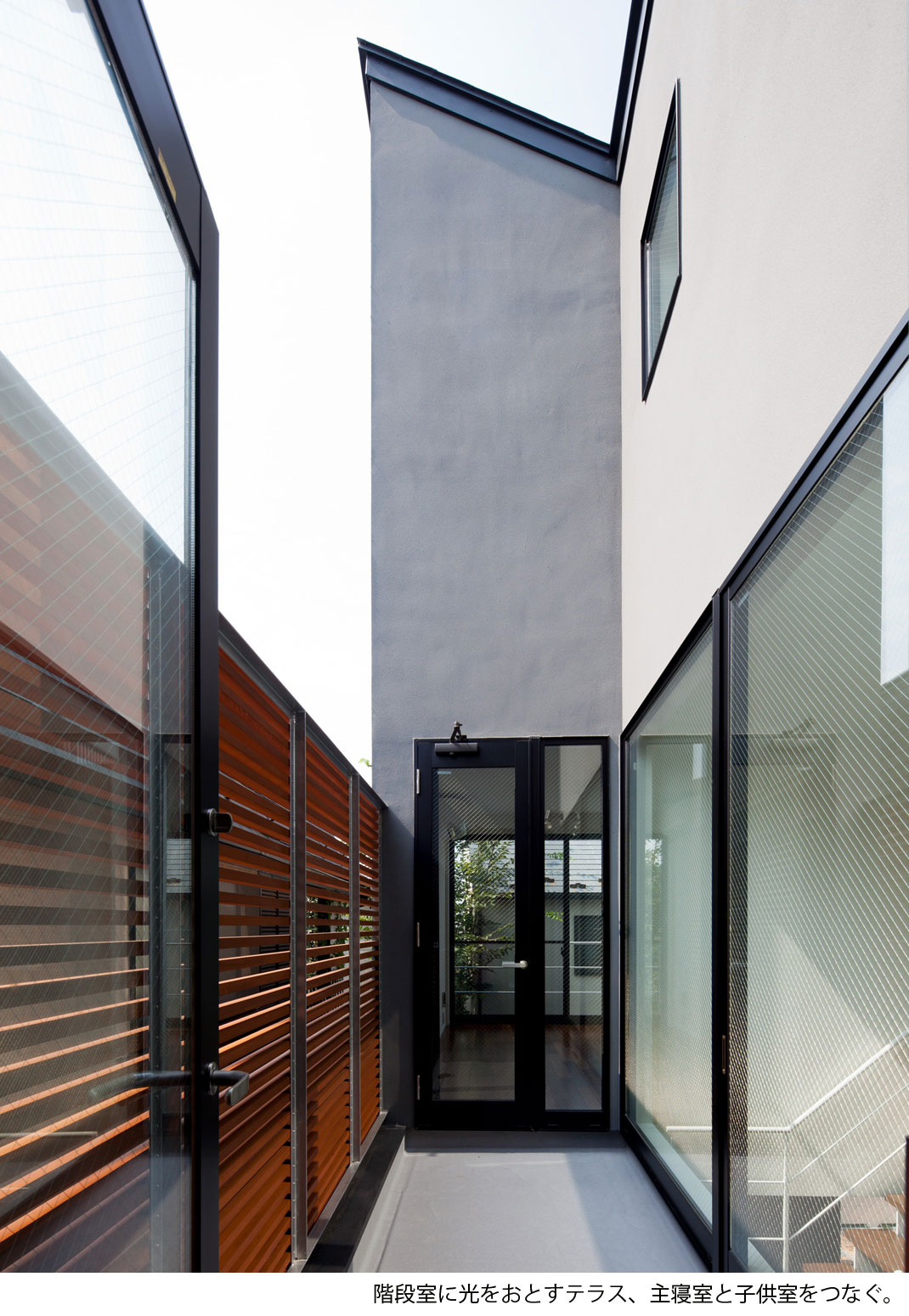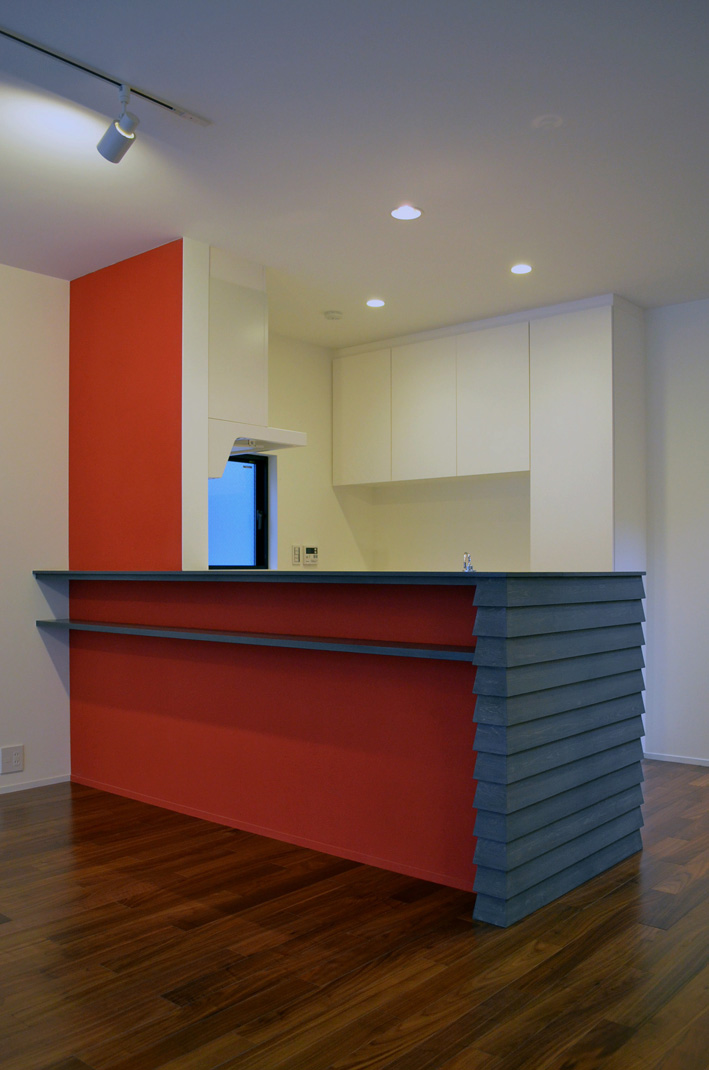 夫婦+小学生の男の子2人の家族の住まい。1階は広いワンルームのようなLDK+趣味室。リビングの中央に設けた階段は、光井戸として、子供達の遊び場として、空間のアクセントとなっています。中庭的な2階のテラスに面する個室は、中央に南北に開口部を持ち、自然環境を活かした明るく風通しのよい空間となっています。。ウォールナットの床と、下見板貼りのキッチンのグレーの壁に、ポイントカラーとして赤を使い、渋いながら元気の出るリビングとしています。