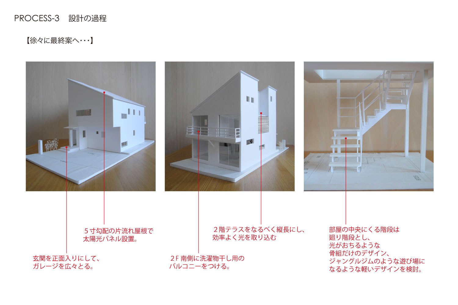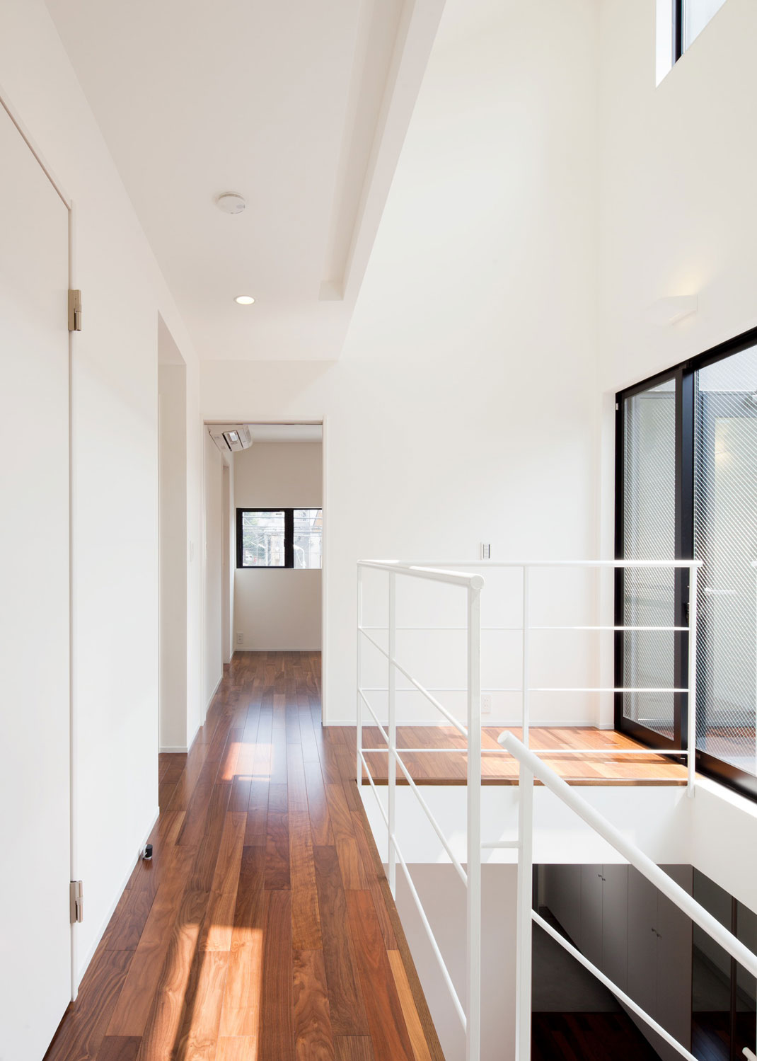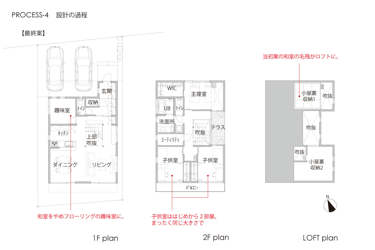 夫婦+小学生の男の子2人の家族の住まい。1階は広いワンルームのようなLDK+趣味室。リビングの中央に設けた階段は、光井戸として、子供達の遊び場として、空間のアクセントとなっています。中庭的な2階のテラスに面する個室は、中央に南北に開口部を持ち、自然環境を活かした明るく風通しのよい空間となっています。。ウォールナットの床と、下見板貼りのキッチンのグレーの壁に、ポイントカラーとして赤を使い、渋いながら元気の出るリビングとしています。