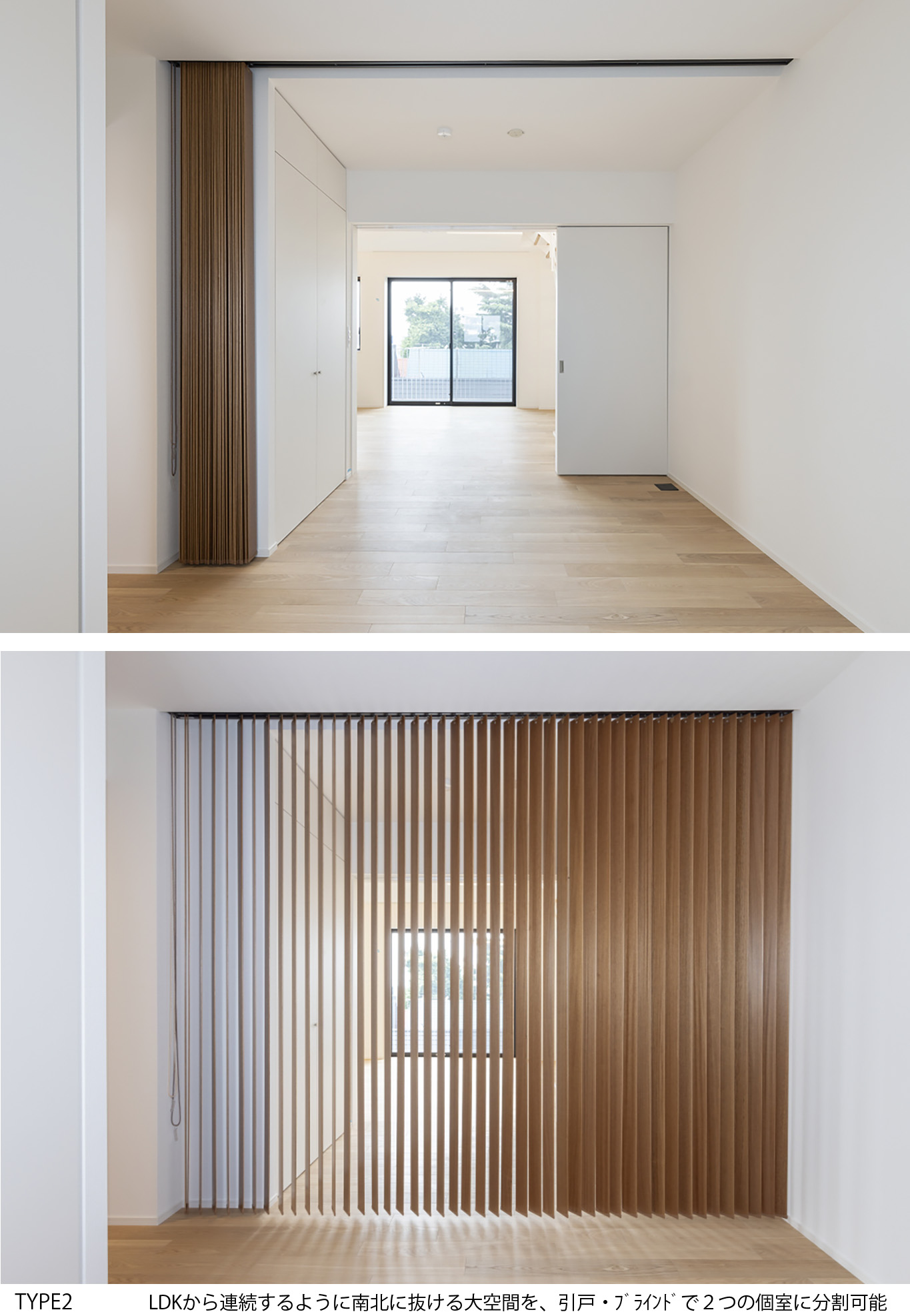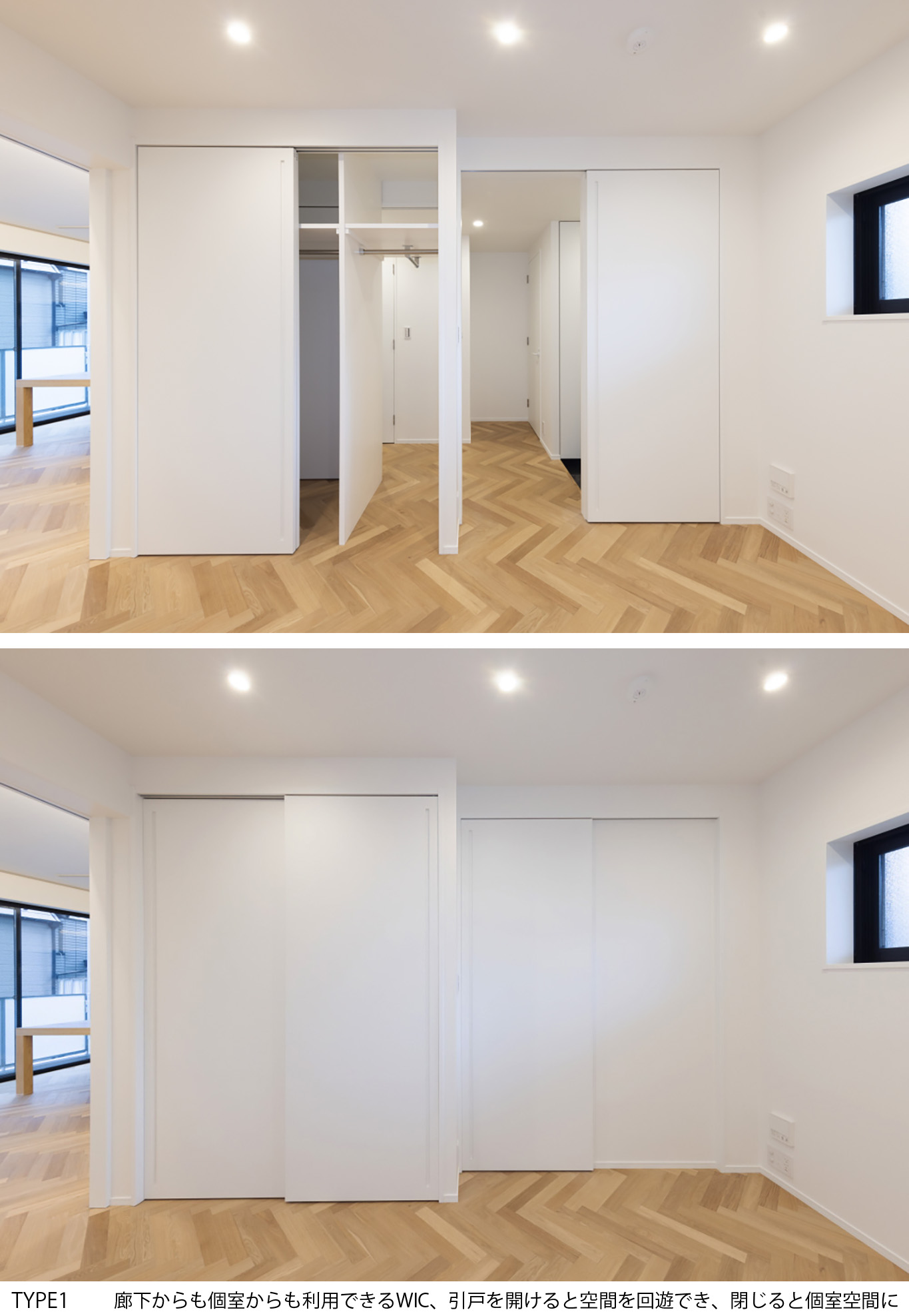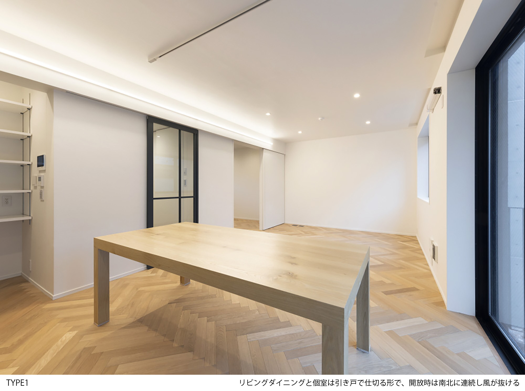 可能な限り南北に風が抜けることに配慮し、広い空間を必要に応じて個室に仕切るプランや、廊下側からも部屋側からも使える収納などの工夫で、限られたスペースを有効に快適に使えるよう考えました。4軒のうち2軒を紹介します。