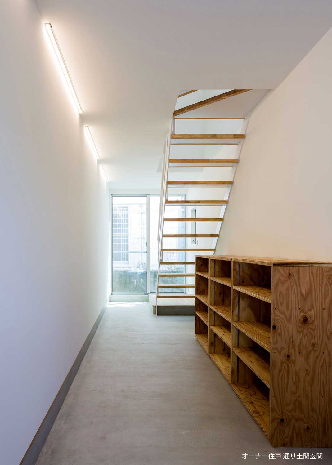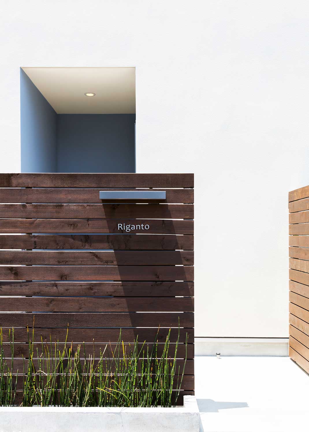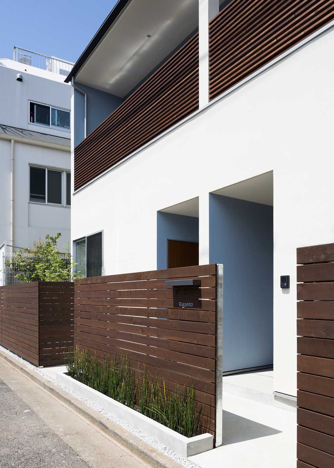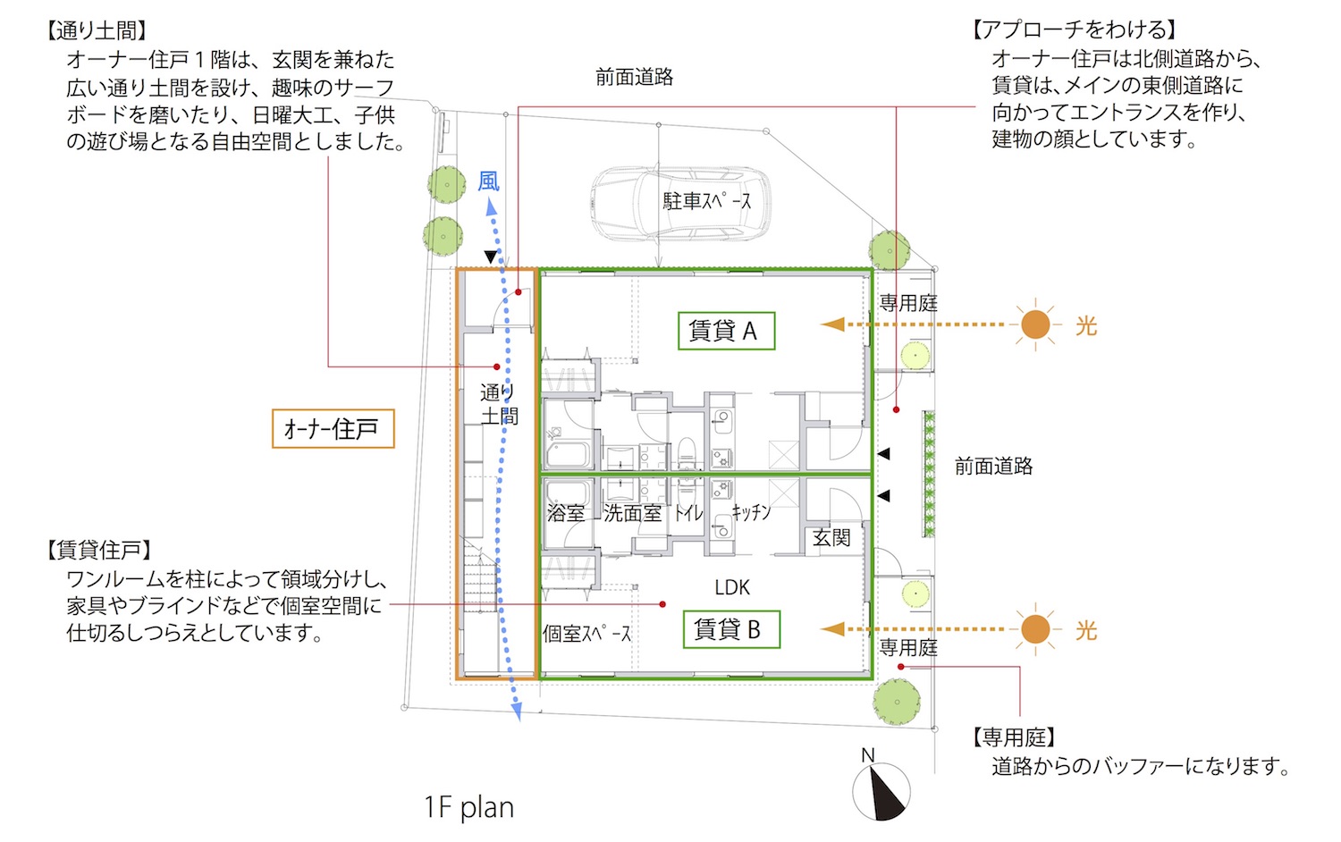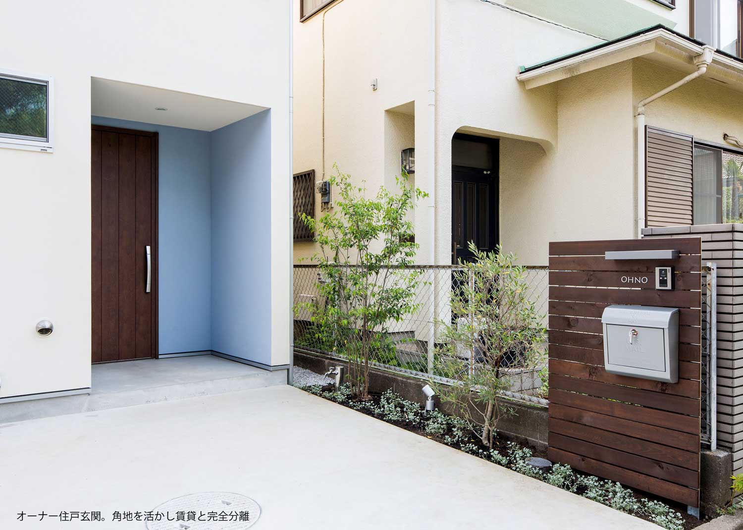 1階に35㎡の賃貸を2軒、2階がオーナー住戸(夫婦+4歳/6歳の兄弟)の賃貸併用長屋住宅。とんがり屋根が目印の、とんがりを逆から読んでRigantoです。角地を活かし、賃貸とオーナーのアプローチ動線をわけ、メインの道路側に、顔となる賃貸エントランスを設けています。1階賃貸は専用庭付き、オーナー住戸は、LDK全面にバルコニーを設け、これを道路からのバッファーとしています。オーナー住戸の玄関は、通り土間とし、趣味のサーフボードを磨いたり、日曜大工、雨の日には子供の遊び場となるような空間としました。