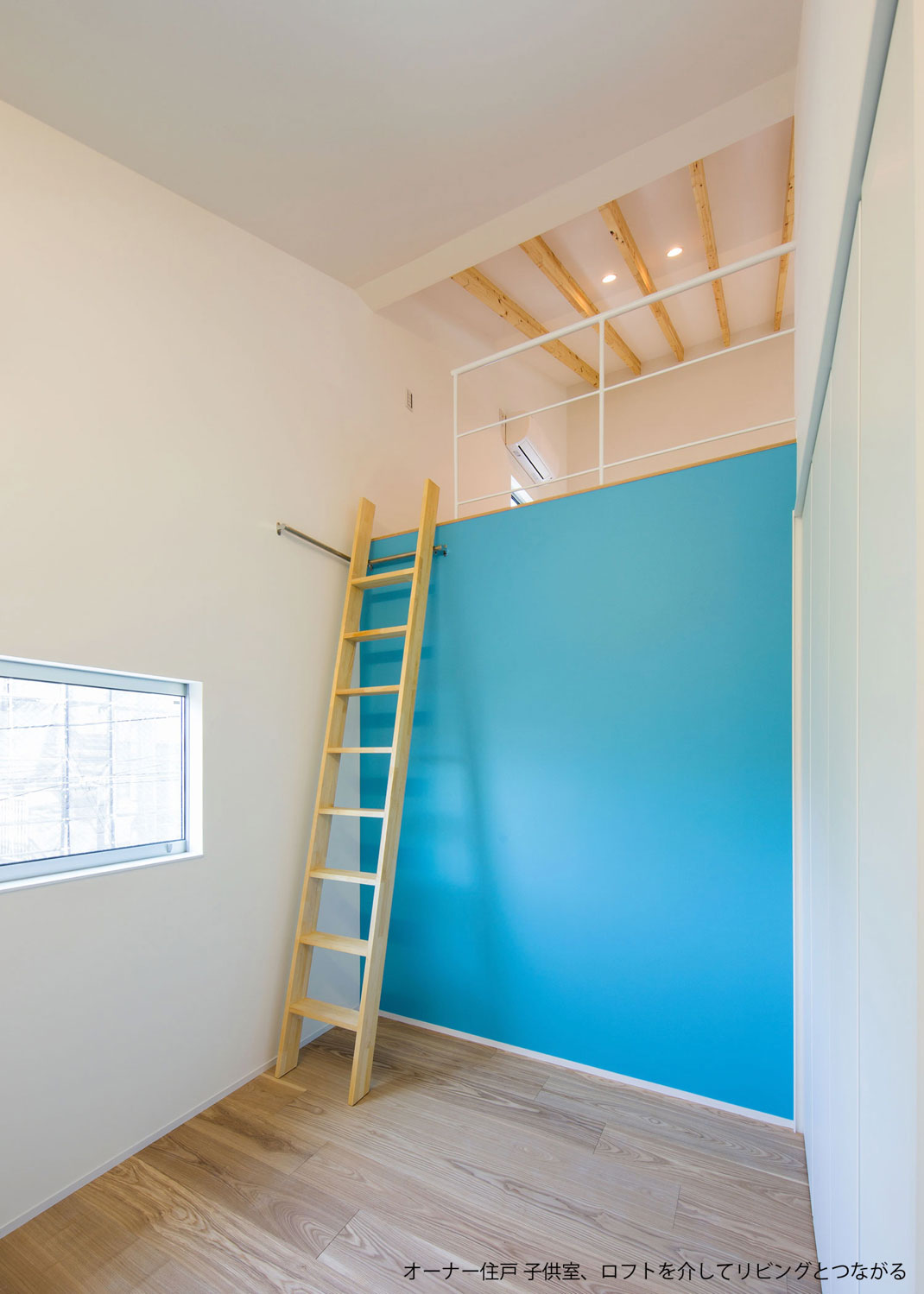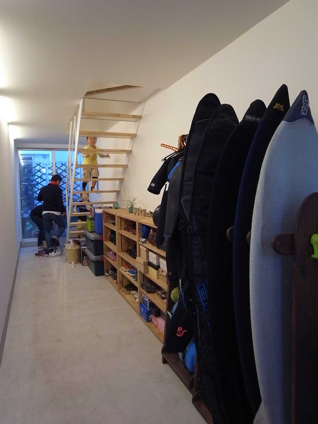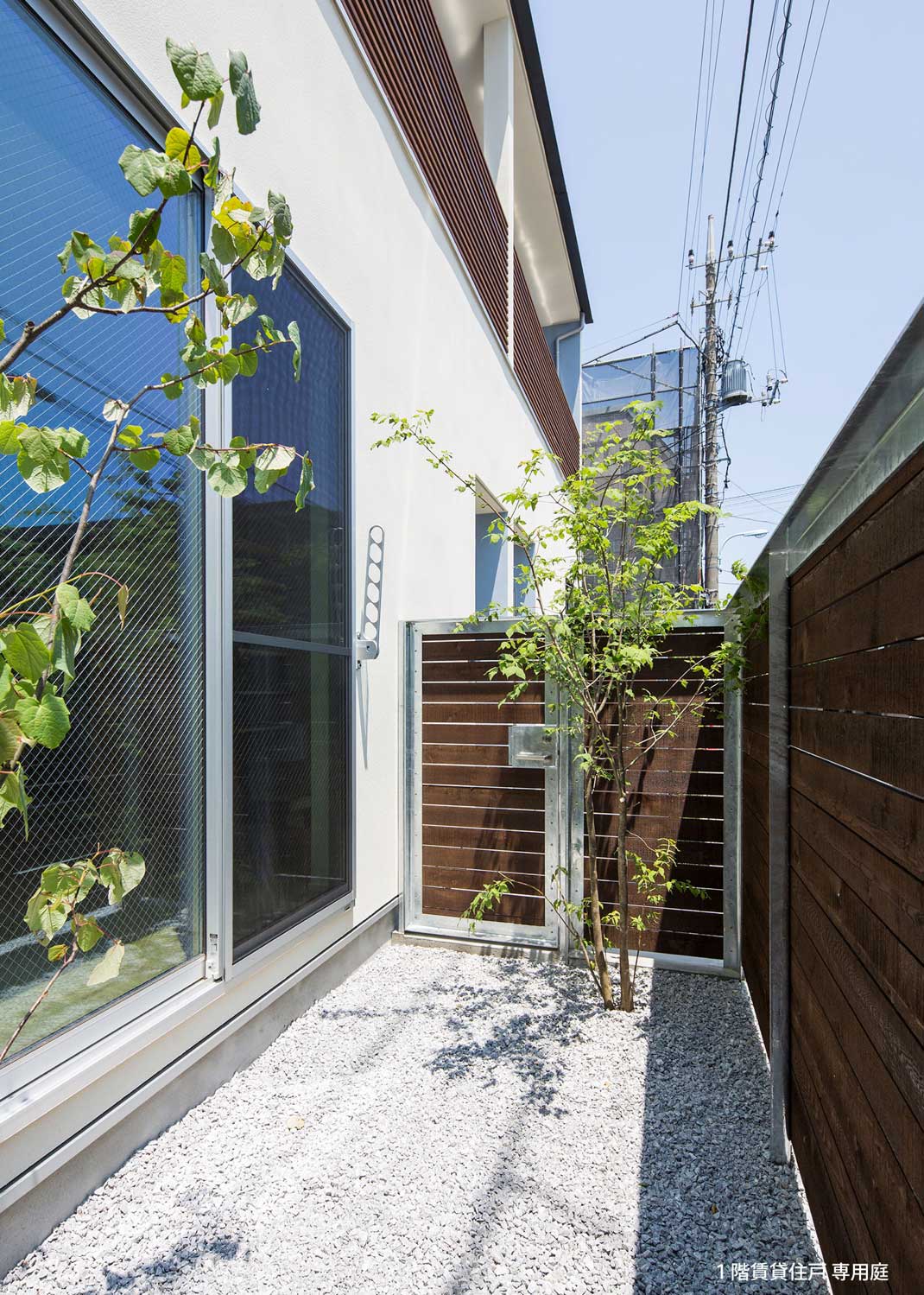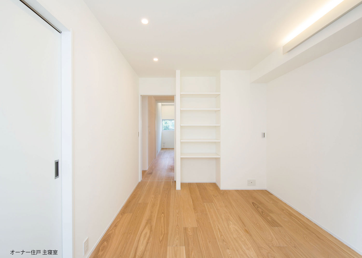 1階に35㎡の賃貸を2軒、2階がオーナー住戸(夫婦+4歳/6歳の兄弟)の賃貸併用長屋住宅。とんがり屋根が目印の、とんがりを逆から読んでRigantoです。角地を活かし、賃貸とオーナーのアプローチ動線をわけ、メインの道路側に、顔となる賃貸エントランスを設けています。1階賃貸は専用庭付き、オーナー住戸は、LDK全面にバルコニーを設け、これを道路からのバッファーとしています。オーナー住戸の玄関は、通り土間とし、趣味のサーフボードを磨いたり、日曜大工、雨の日には子供の遊び場となるような空間としました。