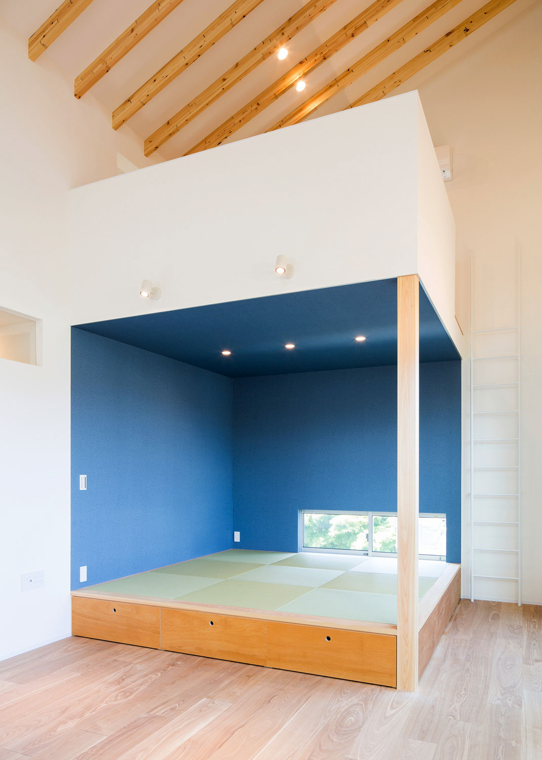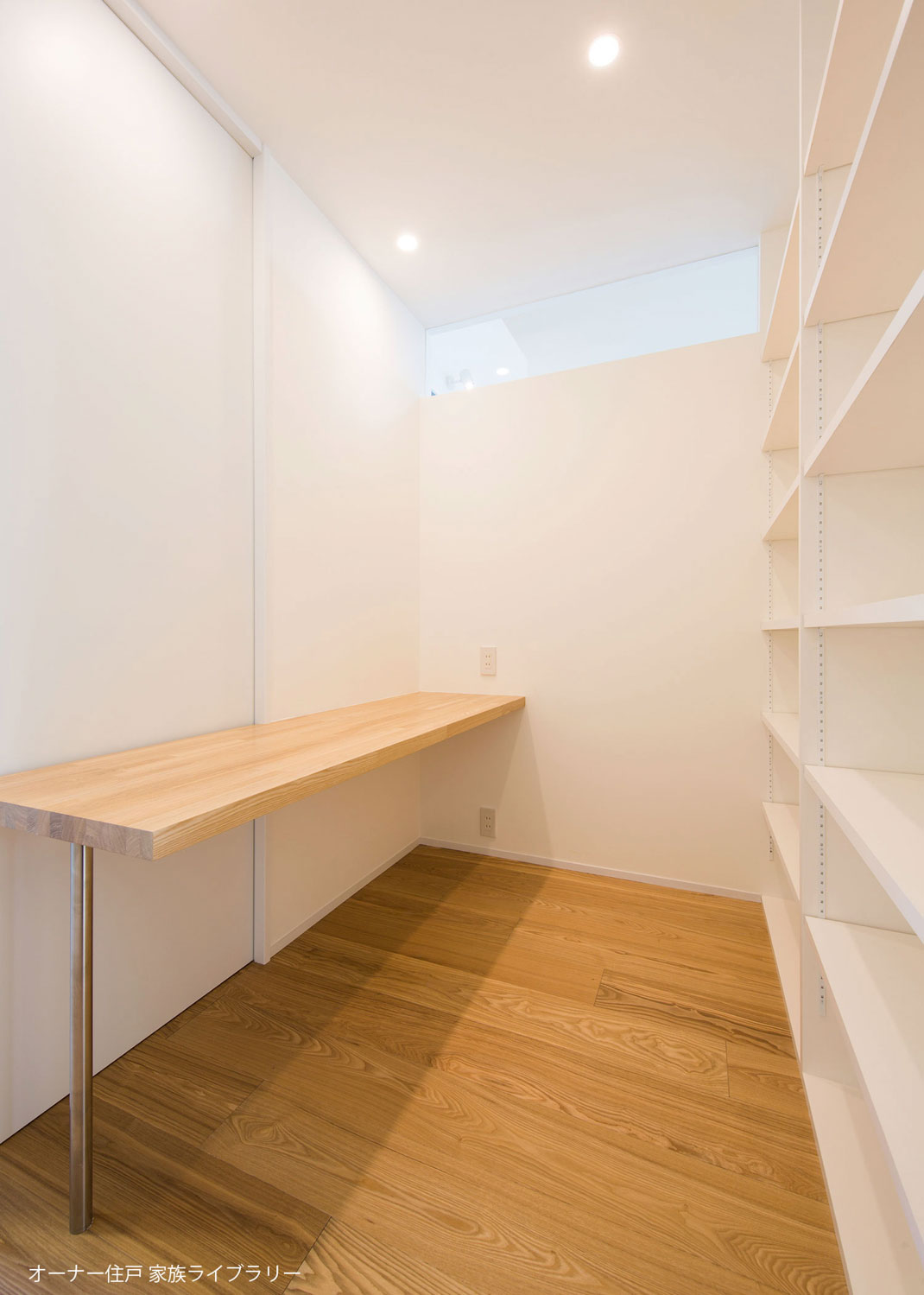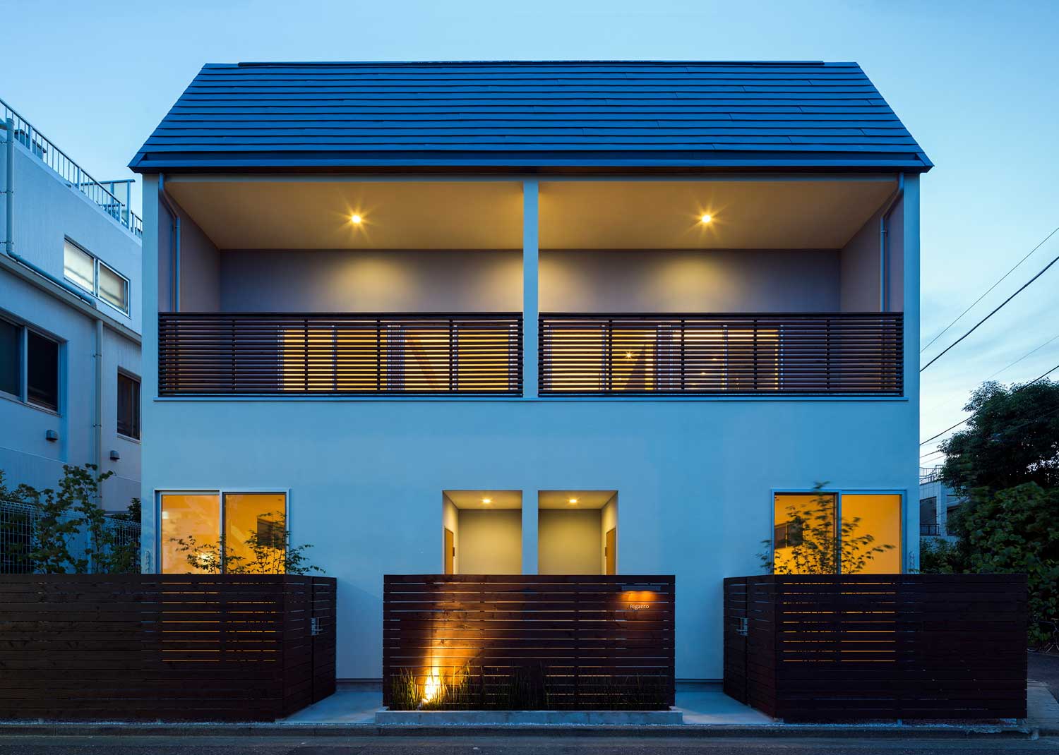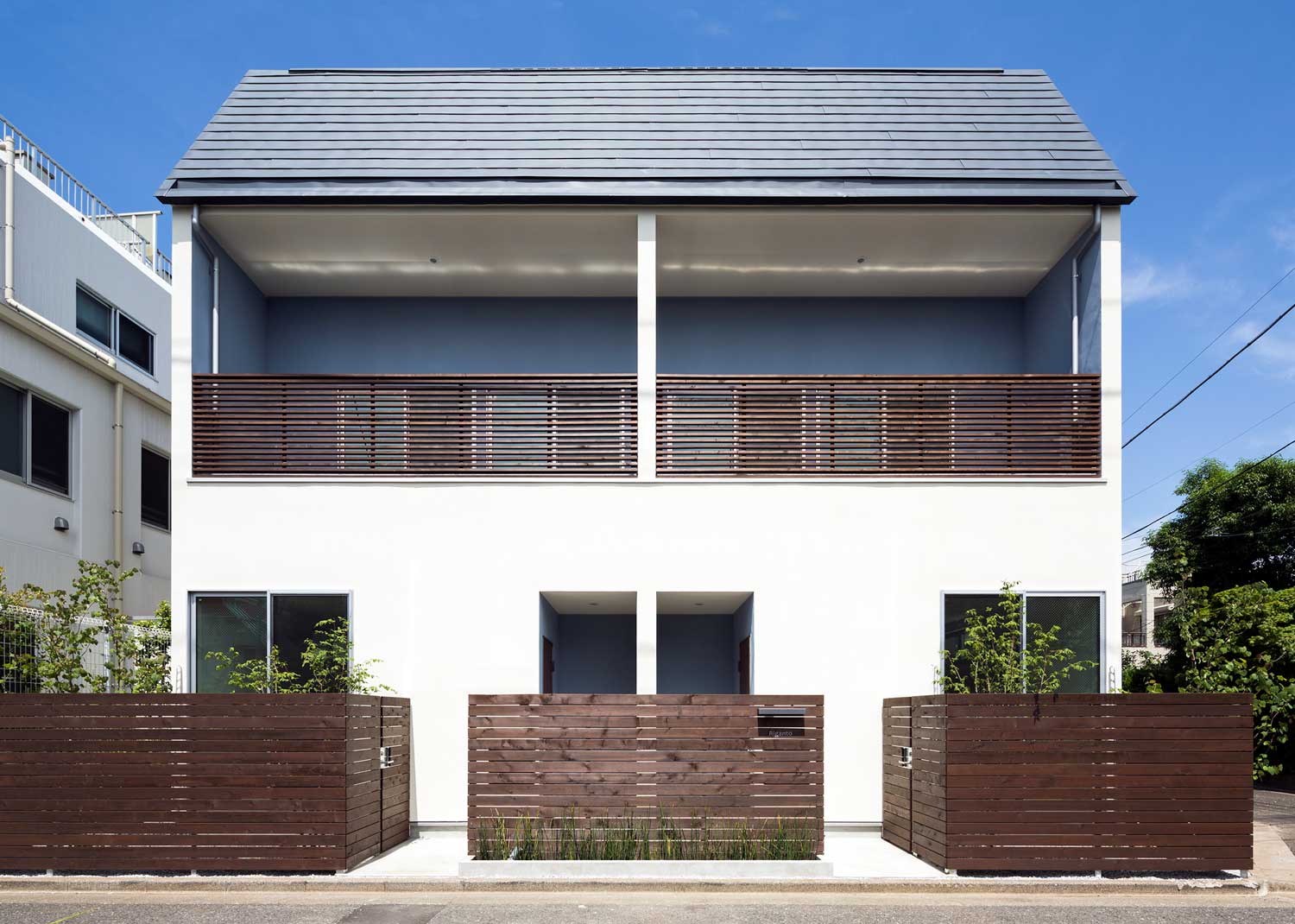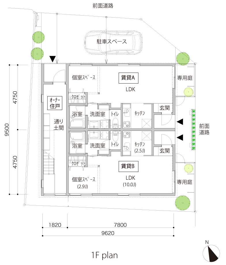 1階に35㎡の賃貸を2軒、2階がオーナー住戸(夫婦+4歳/6歳の兄弟)の賃貸併用長屋住宅。とんがり屋根が目印の、とんがりを逆から読んでRigantoです。角地を活かし、賃貸とオーナーのアプローチ動線をわけ、メインの道路側に、顔となる賃貸エントランスを設けています。1階賃貸は専用庭付き、オーナー住戸は、LDK全面にバルコニーを設け、これを道路からのバッファーとしています。オーナー住戸の玄関は、通り土間とし、趣味のサーフボードを磨いたり、日曜大工、雨の日には子供の遊び場となるような空間としました。
