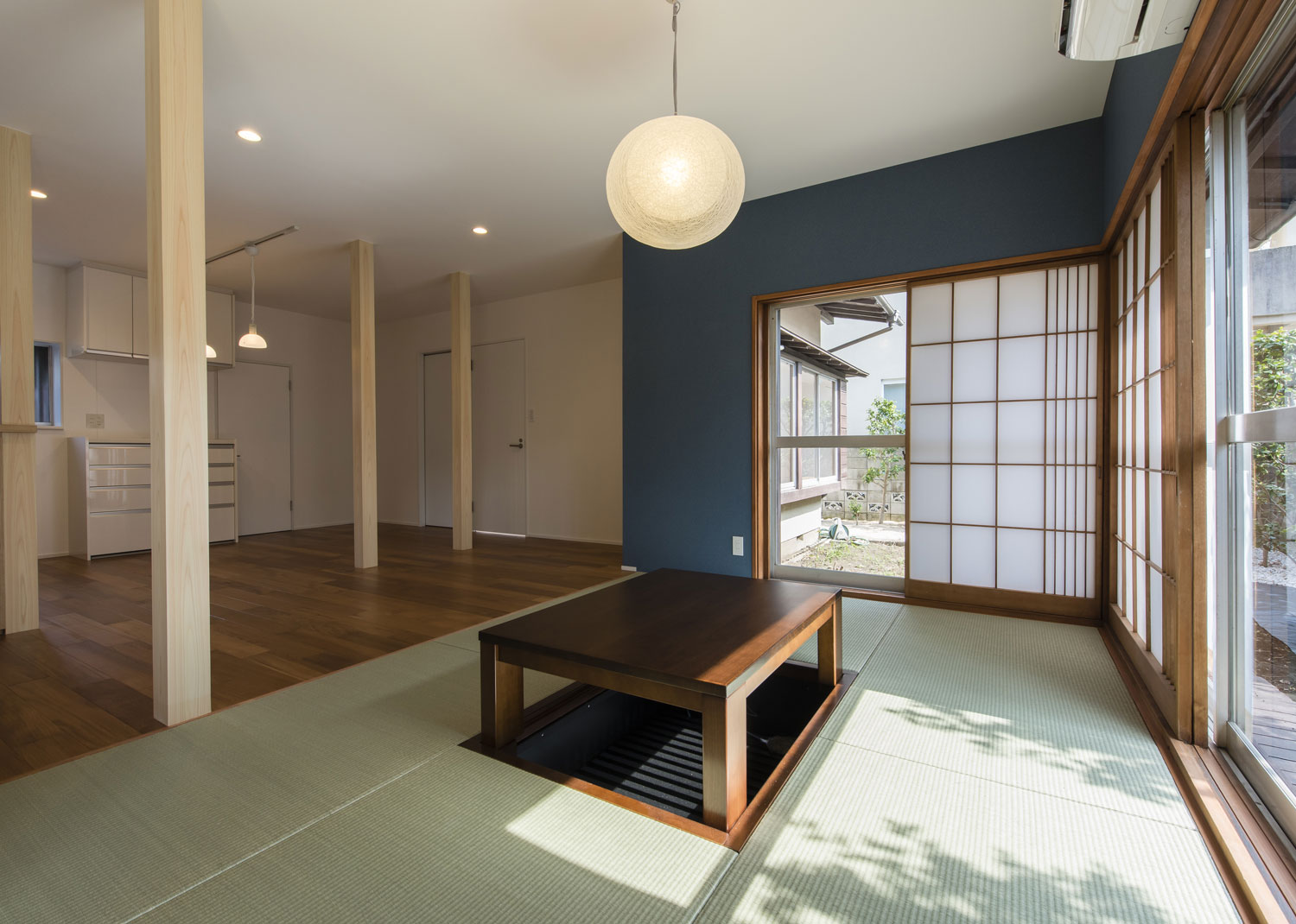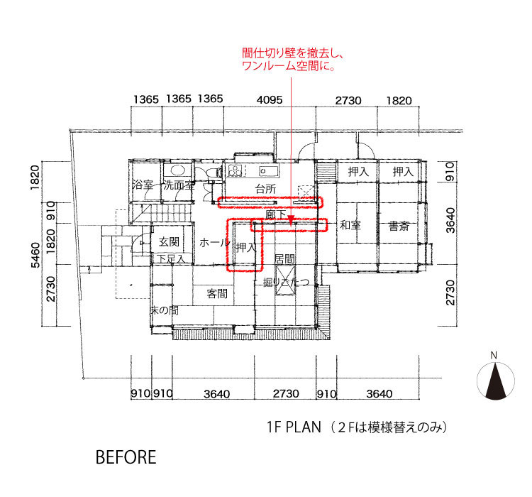 築40年の木造戸建て住宅のリノベーション。1階部分は、客間、居間、寝室、書斎、台所が廊下でつながる プランから、廊下まわりの間仕切り壁を撤去することで、広い リビングダイニングキッチンの空間をつくりました。 すべて和室だった畳の床を、チークのフローリングに変更しつつ、 掘りごたつのあった居間の雰囲気を残したいとのことで、 畳コーナーと掘りごたつを設けています。 壁の中からでてきた柱は、仕上げを施して、そのまま残し、 柱に沿ってダイニングテーブルを配置することで、ダイニング とリビングを緩やかに領域分けするプランとしました。 浴室、洗面を拡張したり、玄関の収納を増やしたり、機能の 充実をはかる工夫をしながら、床の間や障子などは既存利用し、 かつての面影を残しながら、新しい住まいが完成しました。