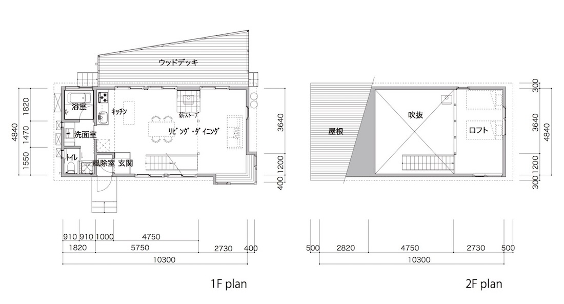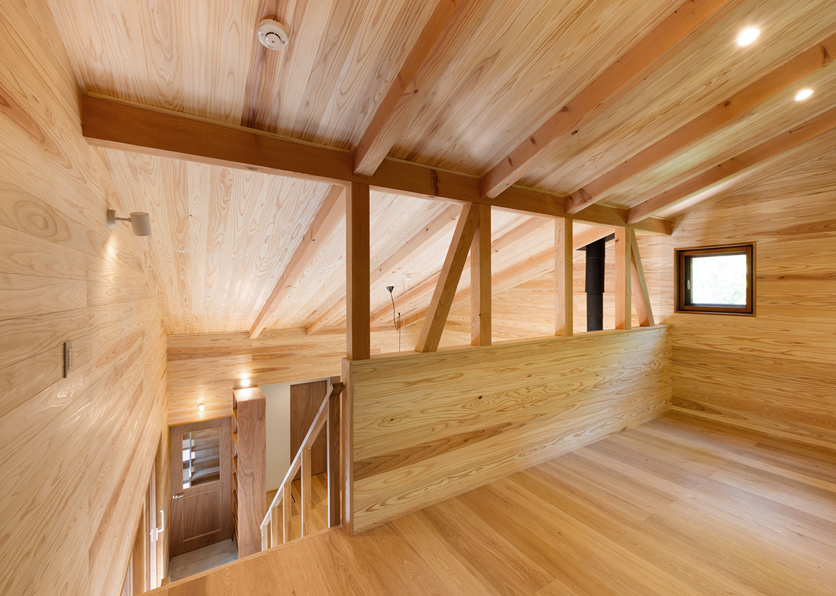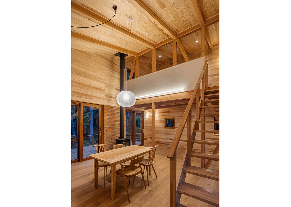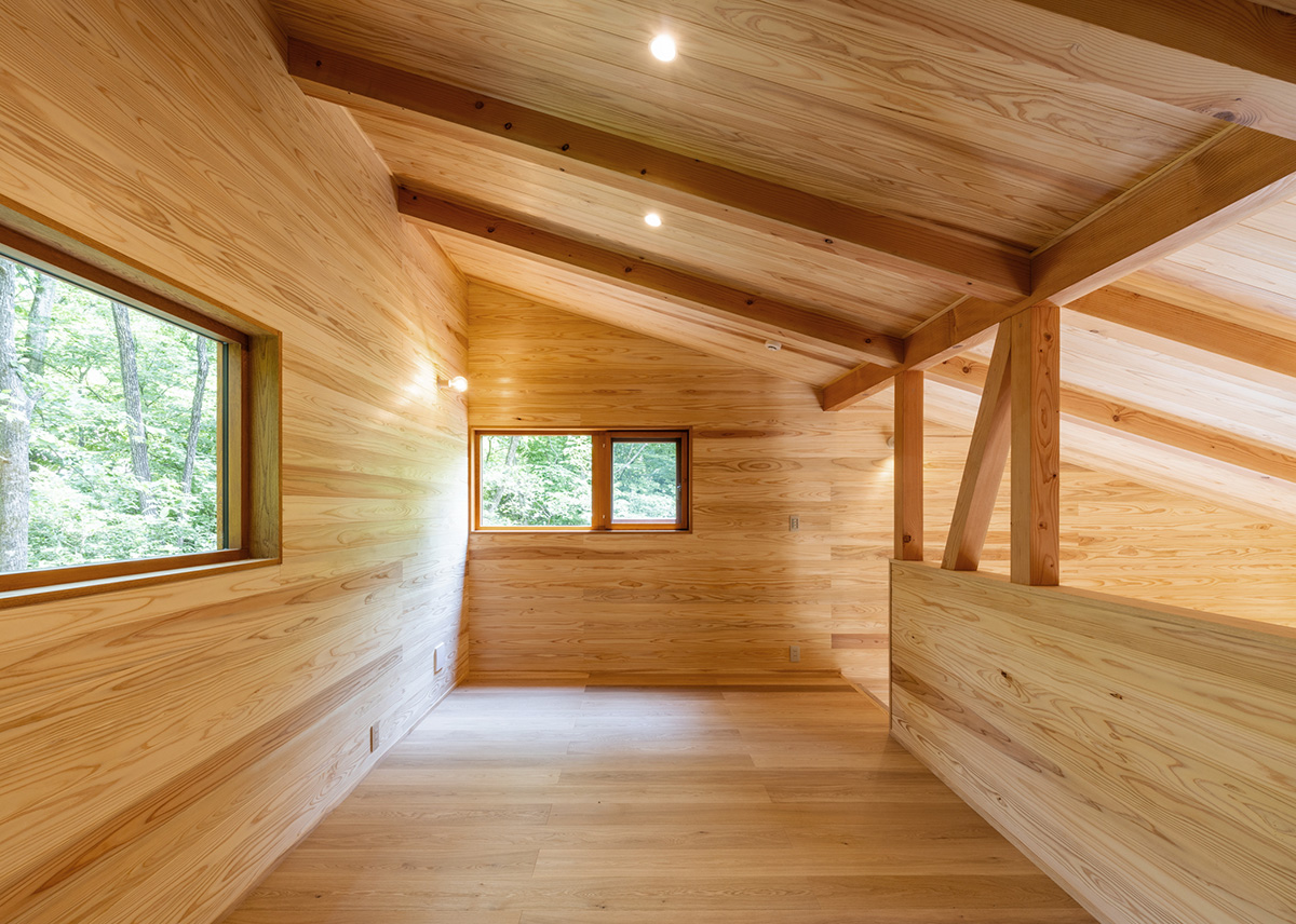 プランはごくシンプルなワンルーム、将来的に子世帯も泊まることのできるよう一部2階を設けた山小屋のような建物です。