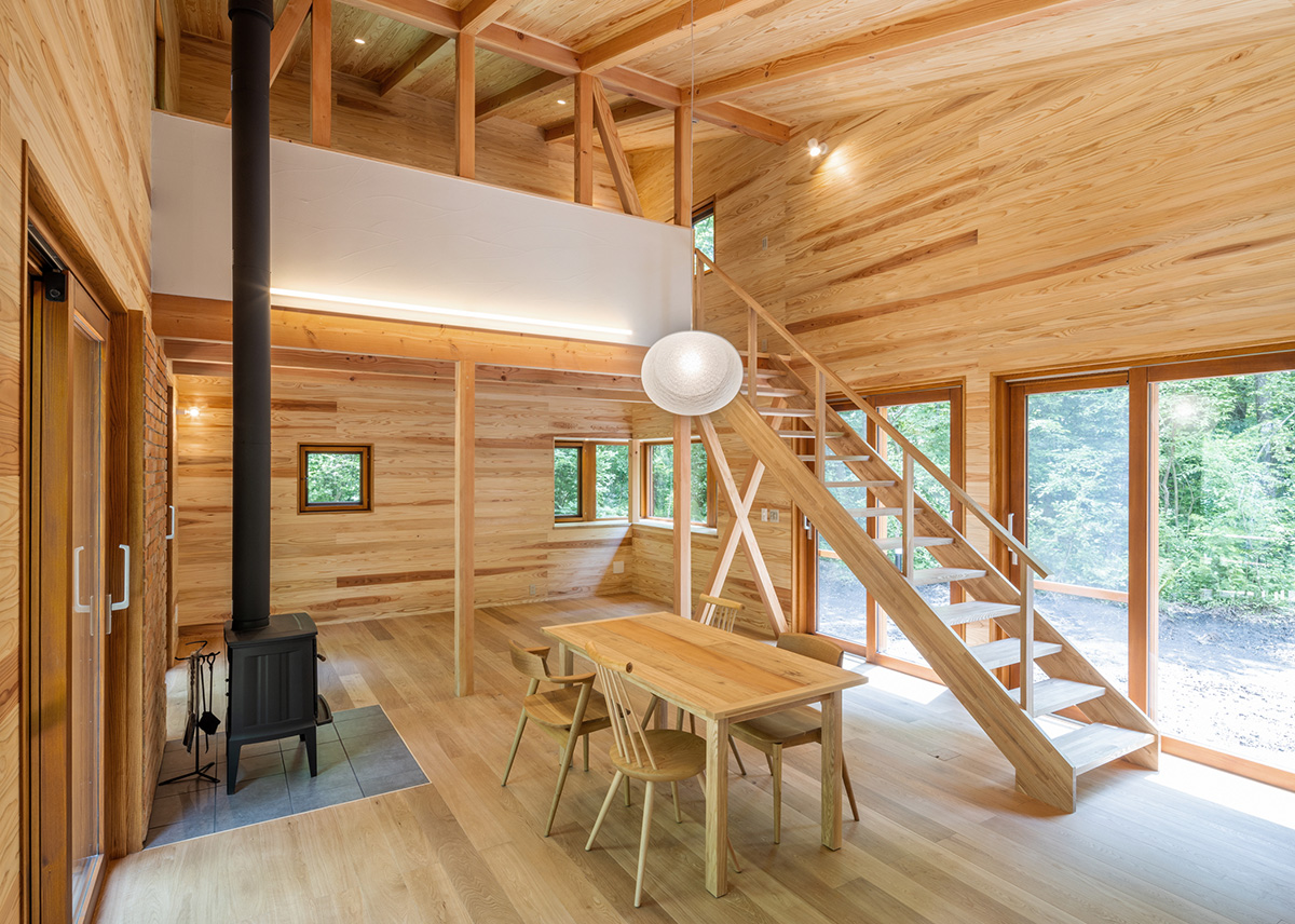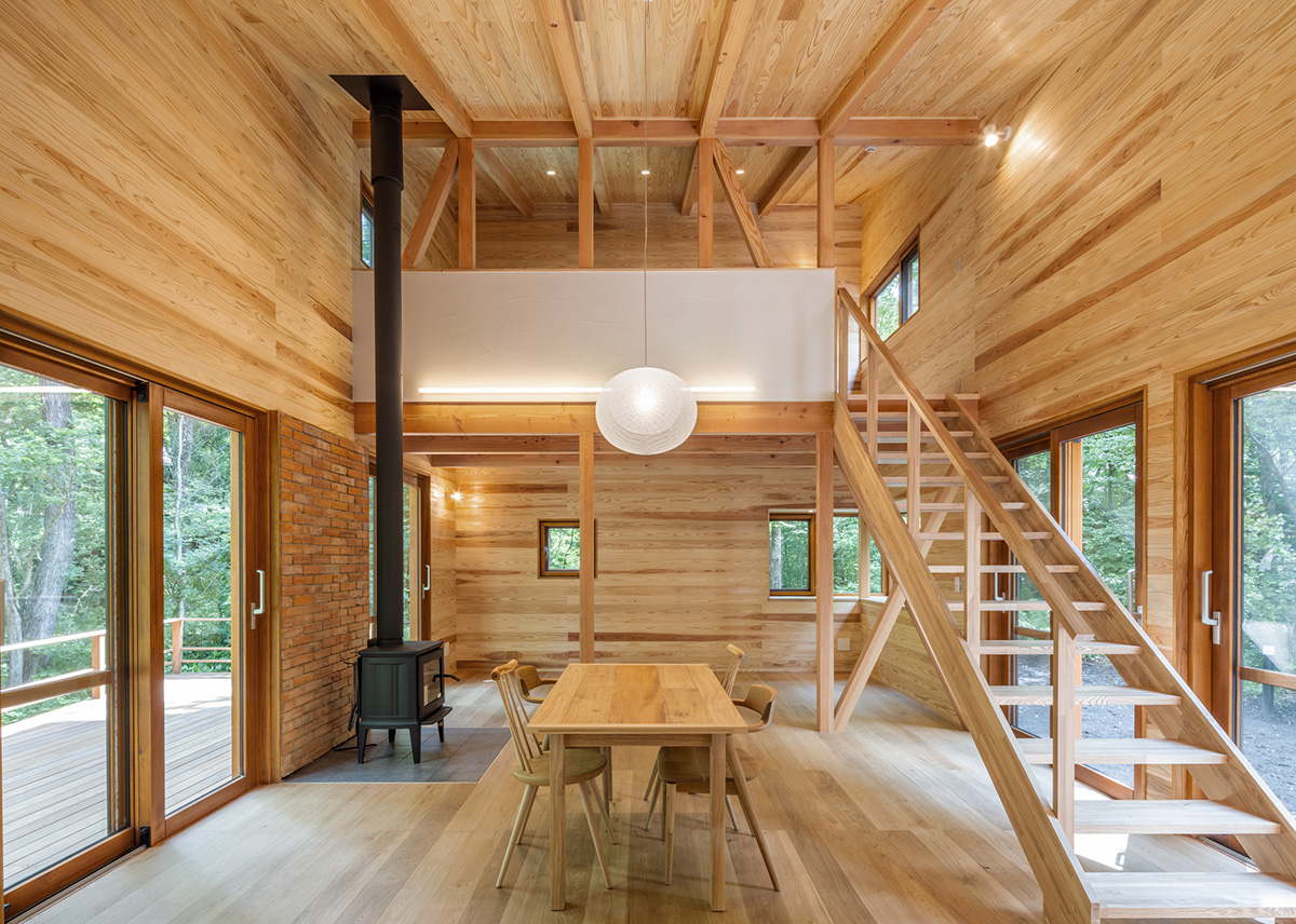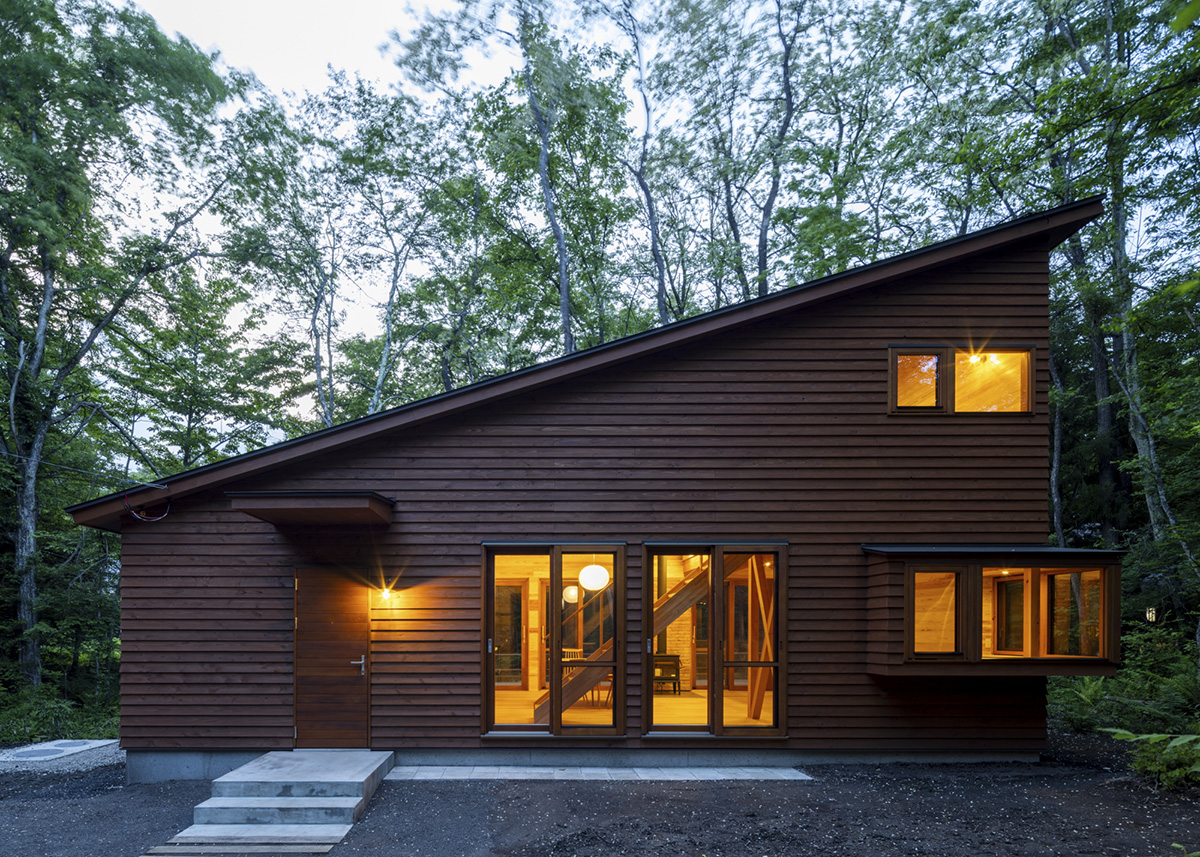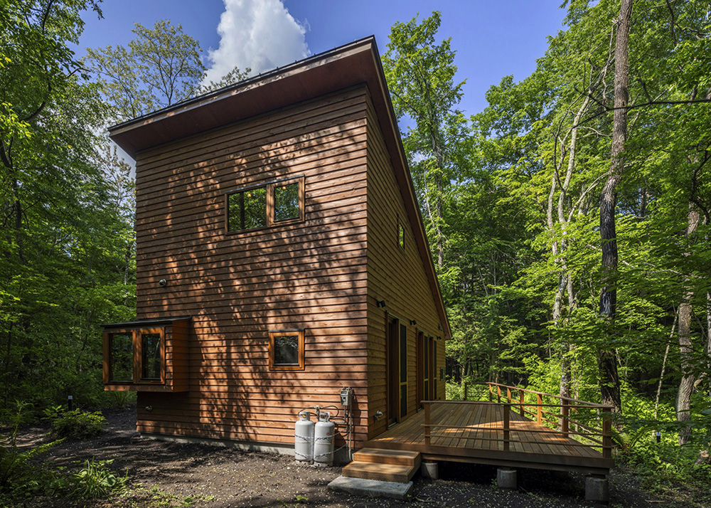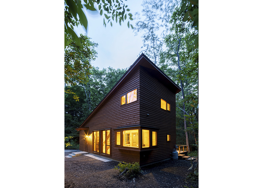 『遠い将来取り壊す時に再生不可能な材が最小限になるような家がいい』という施主の言葉から始まった計画は、時を経て味がでてくるような素材を選び、周囲の森に溶け込んでいくような、寒い冬にもひっそりと篭るプライベート空間を目指し、『書斎のようなプライベートな場所』をコンセプトに、寒い冬にもひっそりと篭ることのできる冬仕様の小さな山荘となりました。
