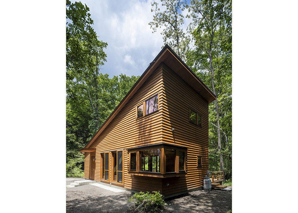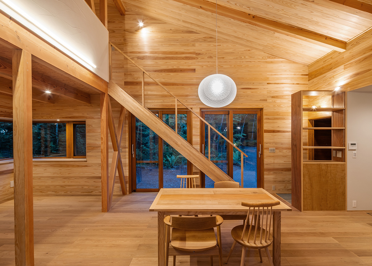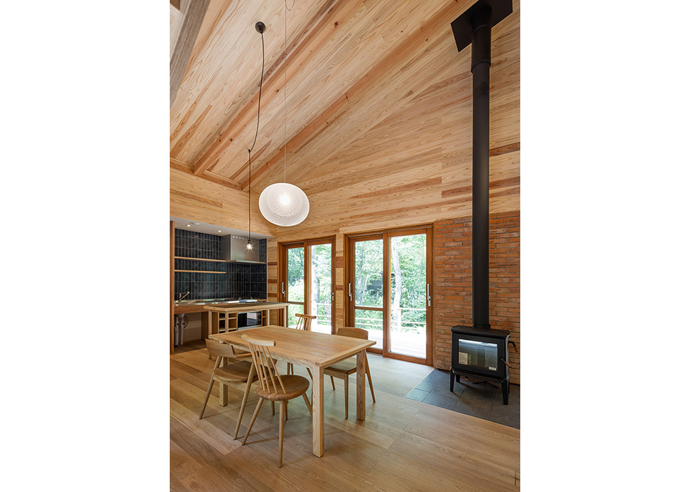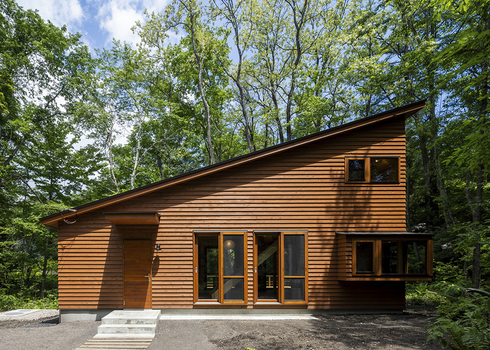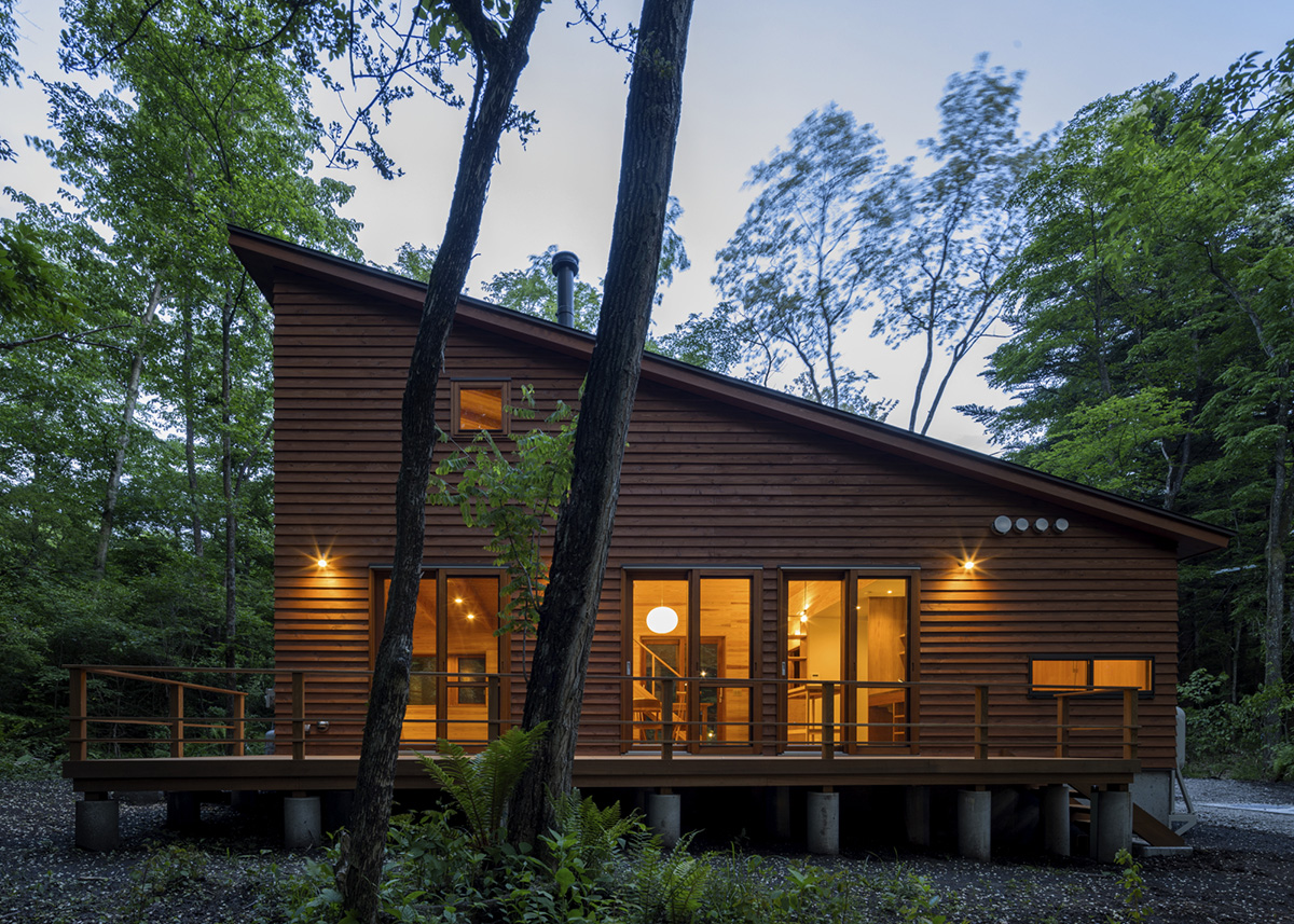 『遠い将来取り壊す時に再生不可能な材が最小限になるような家がいい』という施主の言葉から始まった計画は、時を経て味がでてくるような素材を選び、周囲の森に溶け込んでいくような、寒い冬にもひっそりと篭るプライベート空間を目指し、『書斎のようなプライベートな場所』をコンセプトに、寒い冬にもひっそりと篭ることのできる冬仕様の小さな山荘となりました。