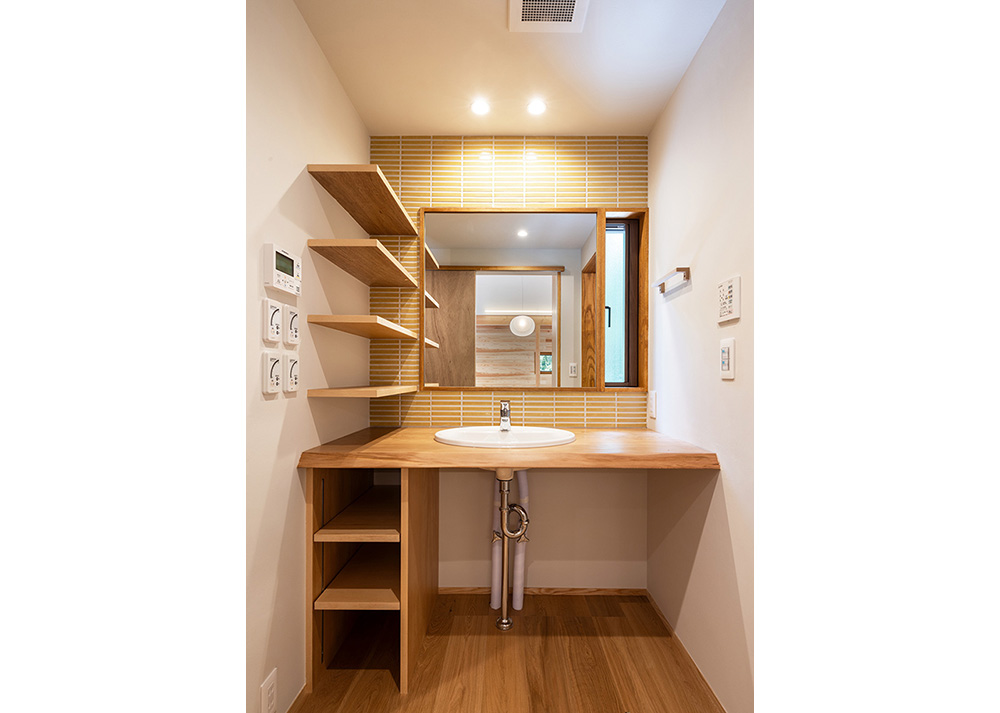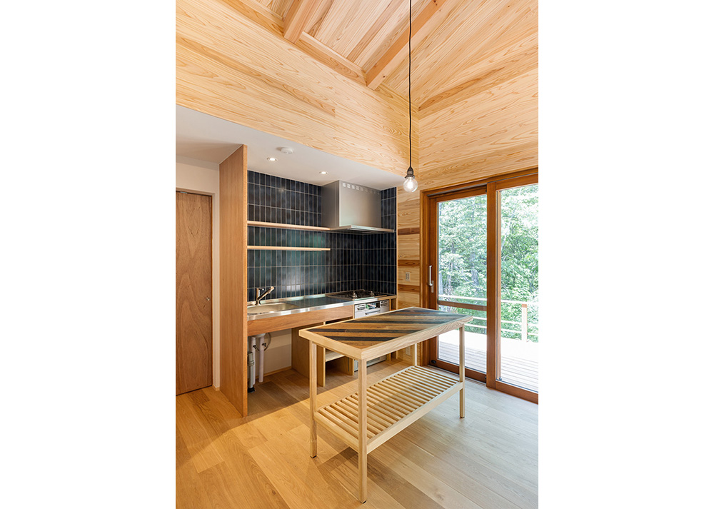 「再生可能、土に還るような家」というコンセプトから当初より廃材利用を検討、諏訪にあるリビルディングセンターにたびたび通い、カウンターや棚板、家具にはレスキュー材(解体する建物から引き取った古材)を使用しました。