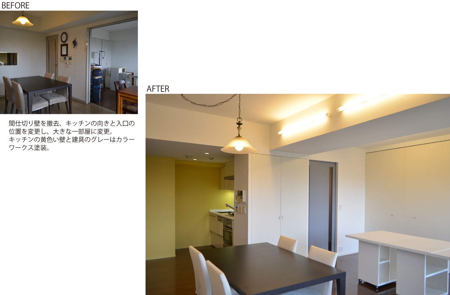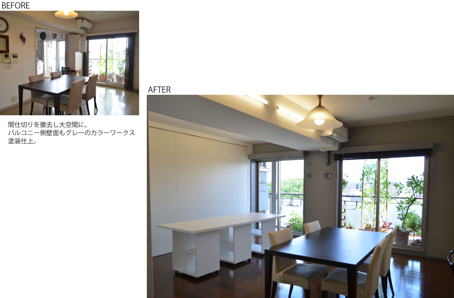 LDKと洋室が引き戸で連続していたものを、壁をとりはらって一室にし、空間をよりすっきり広々と使えるようにしています。