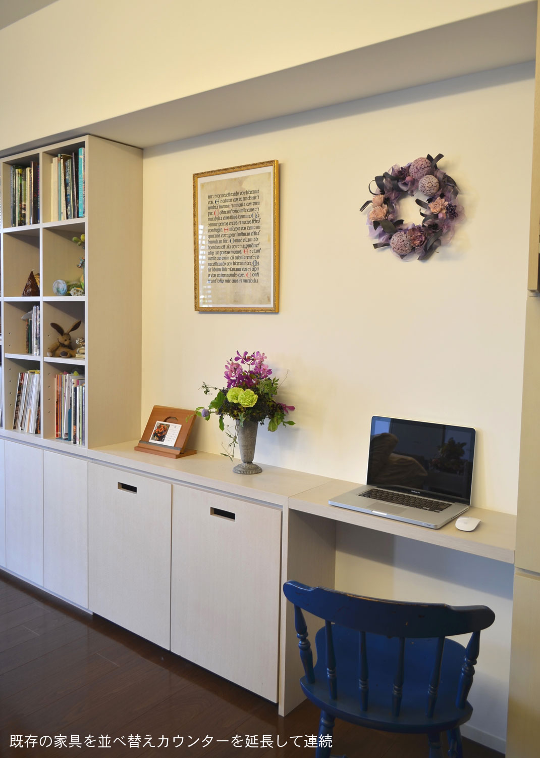 段階的に造作していた家具を、もう片方の壁面にまとめカウンターでつないで一体化しています。