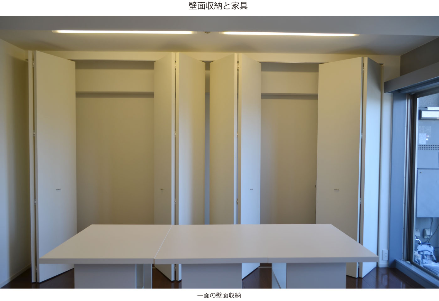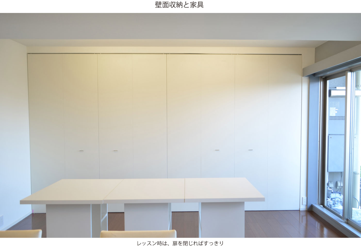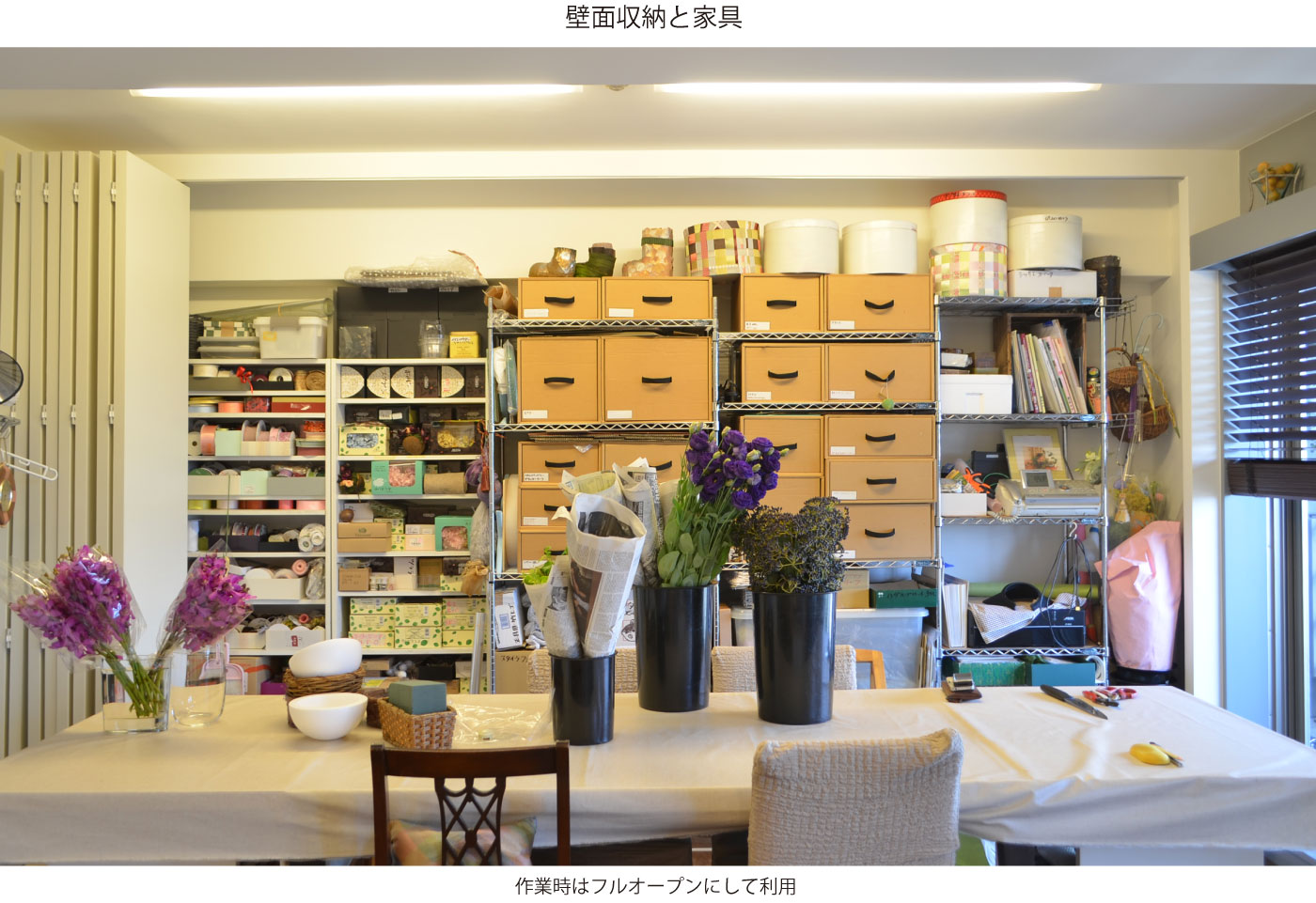道具・材料は、壁一面の収納へ、アトリエ使用時は開けたまま、レッスン時は閉じて使用できるように、扉をフリーの折戸としています。