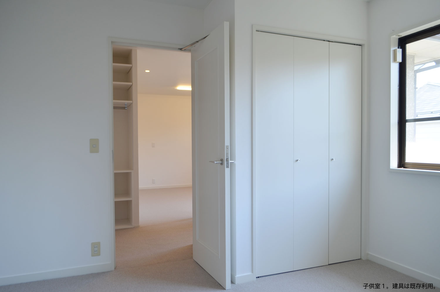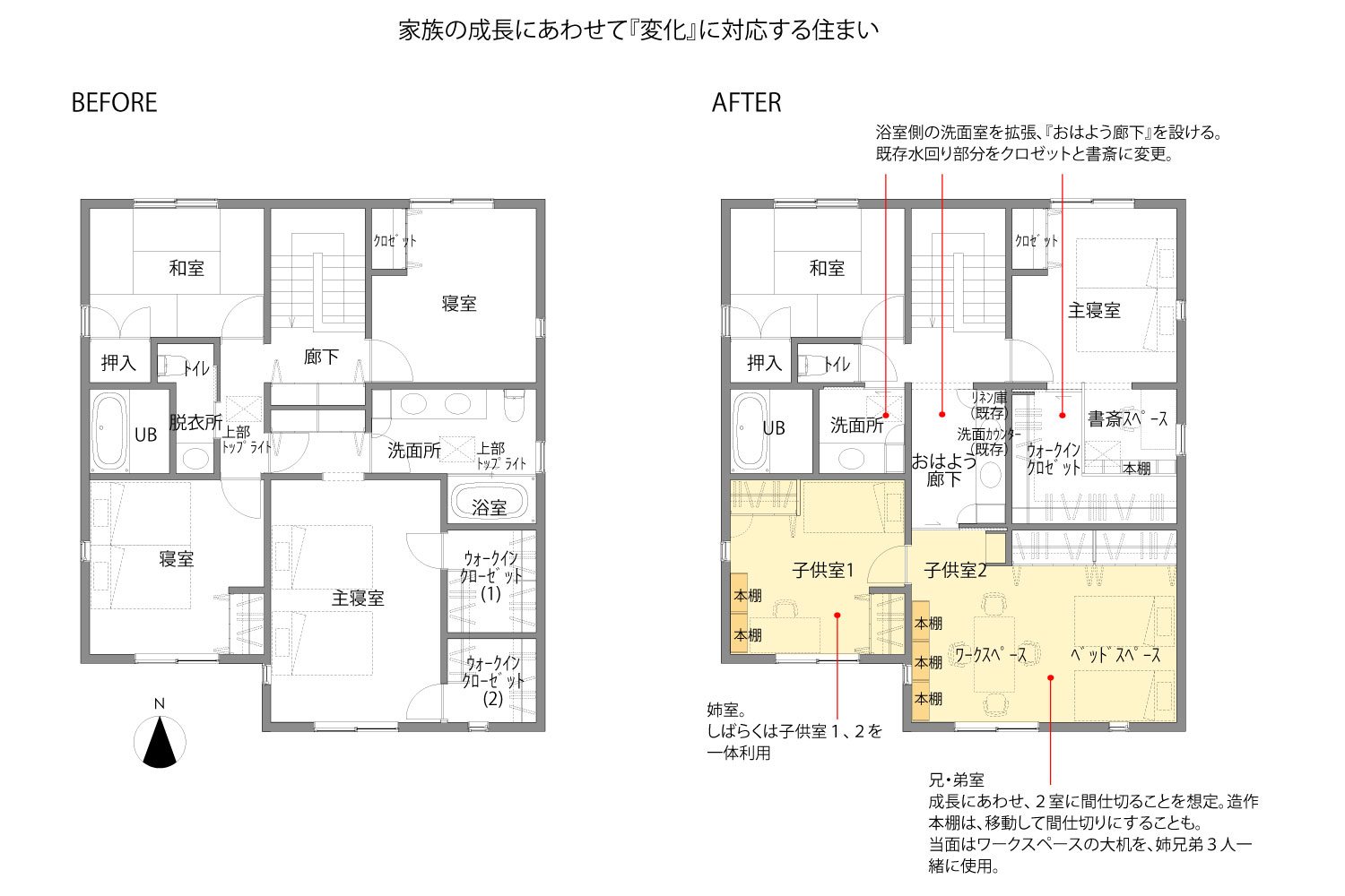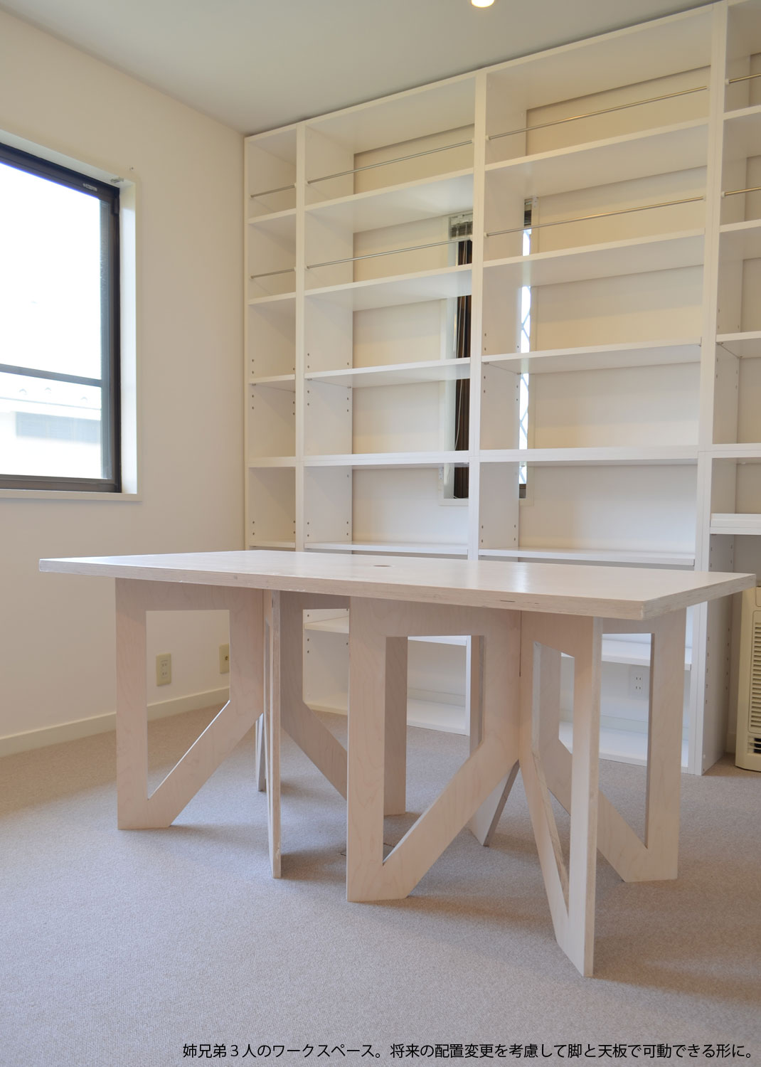 戸建住宅の個室空間部分のリノベーション。家族5人、夫婦+子供3人(女子、男子、男子)が、今ある3つの個室を、どう共有し、どう『個人』のスペースを持ちながら使うのか。ツーバイフォーという構造のしばりの中で、間仕切りは極力いじらず、時間の経過と子供たちの成長に応じて『変化』に対応できるフレキシブルな空間としています。