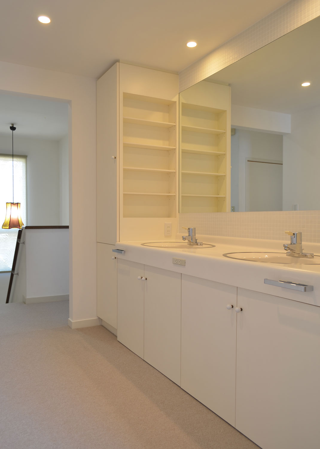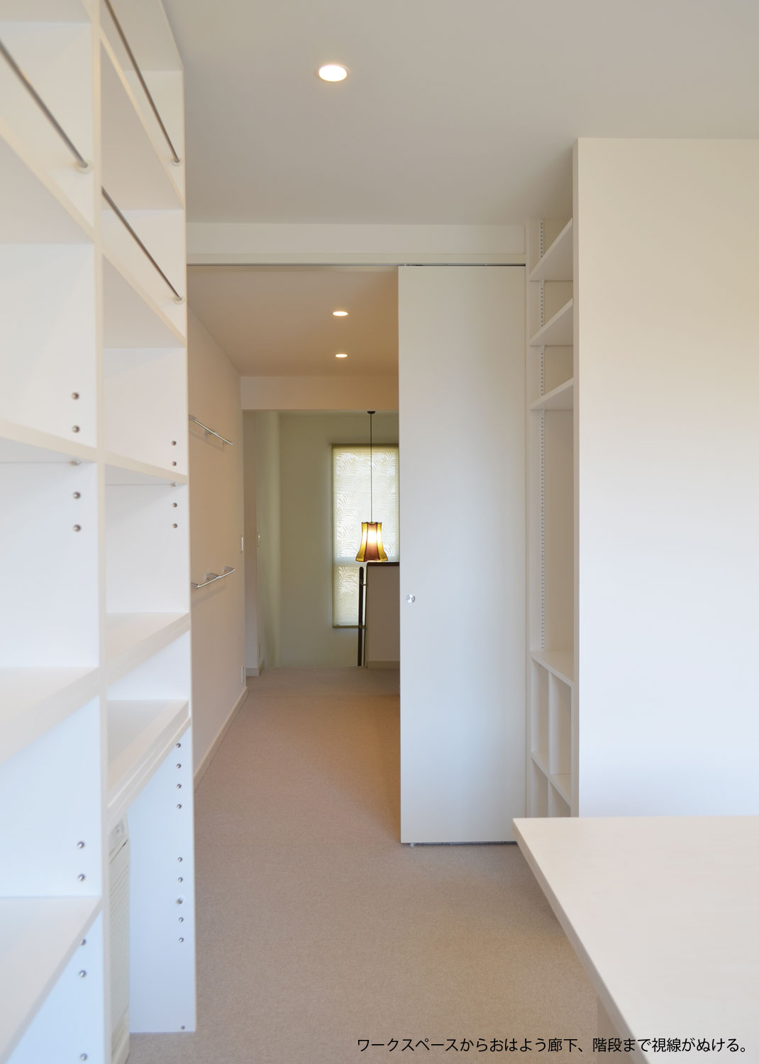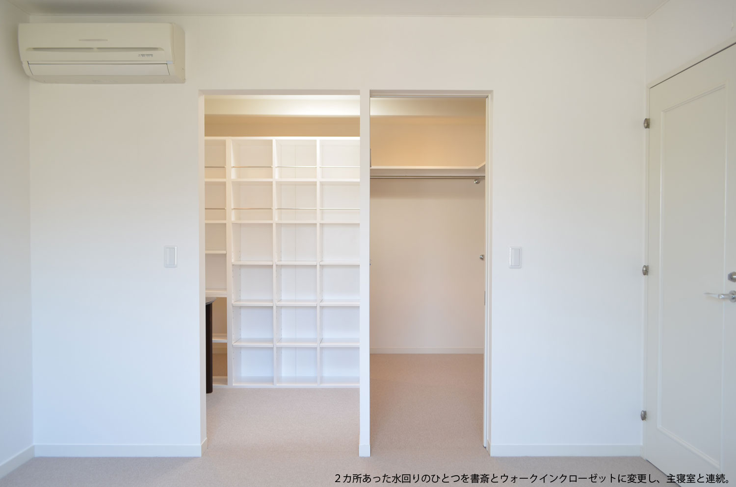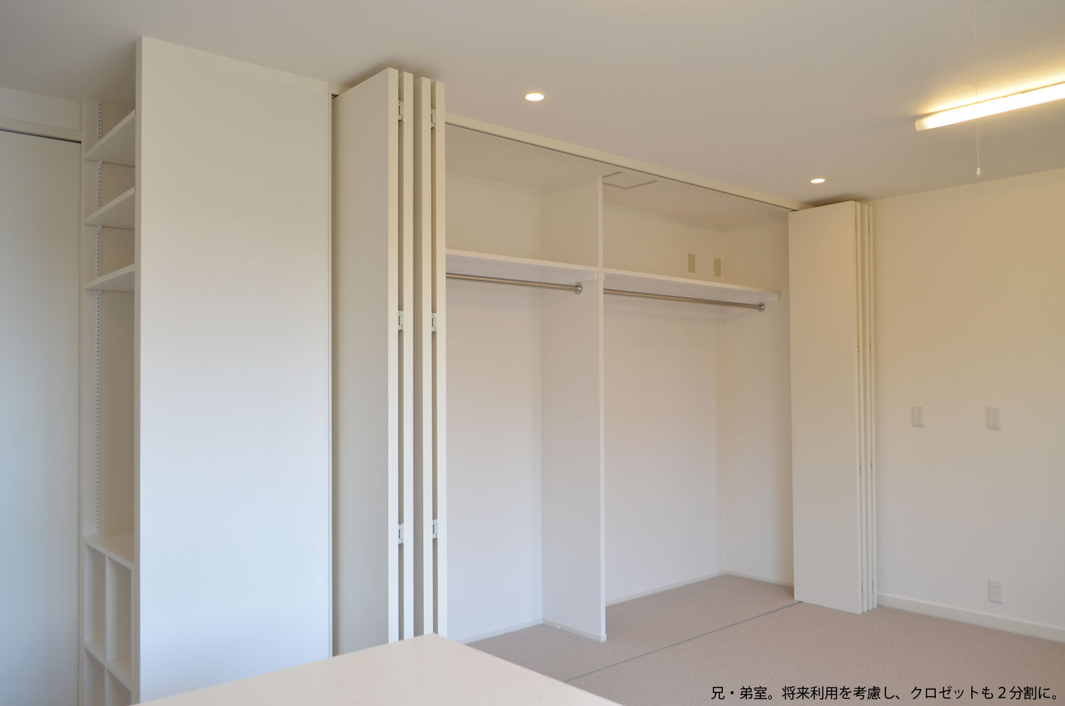 戸建住宅の個室空間部分のリノベーション。家族5人、夫婦+子供3人(女子、男子、男子)が、今ある3つの個室を、どう共有し、どう『個人』のスペースを持ちながら使うのか。ツーバイフォーという構造のしばりの中で、間仕切りは極力いじらず、時間の経過と子供たちの成長に応じて『変化』に対応できるフレキシブルな空間としています。